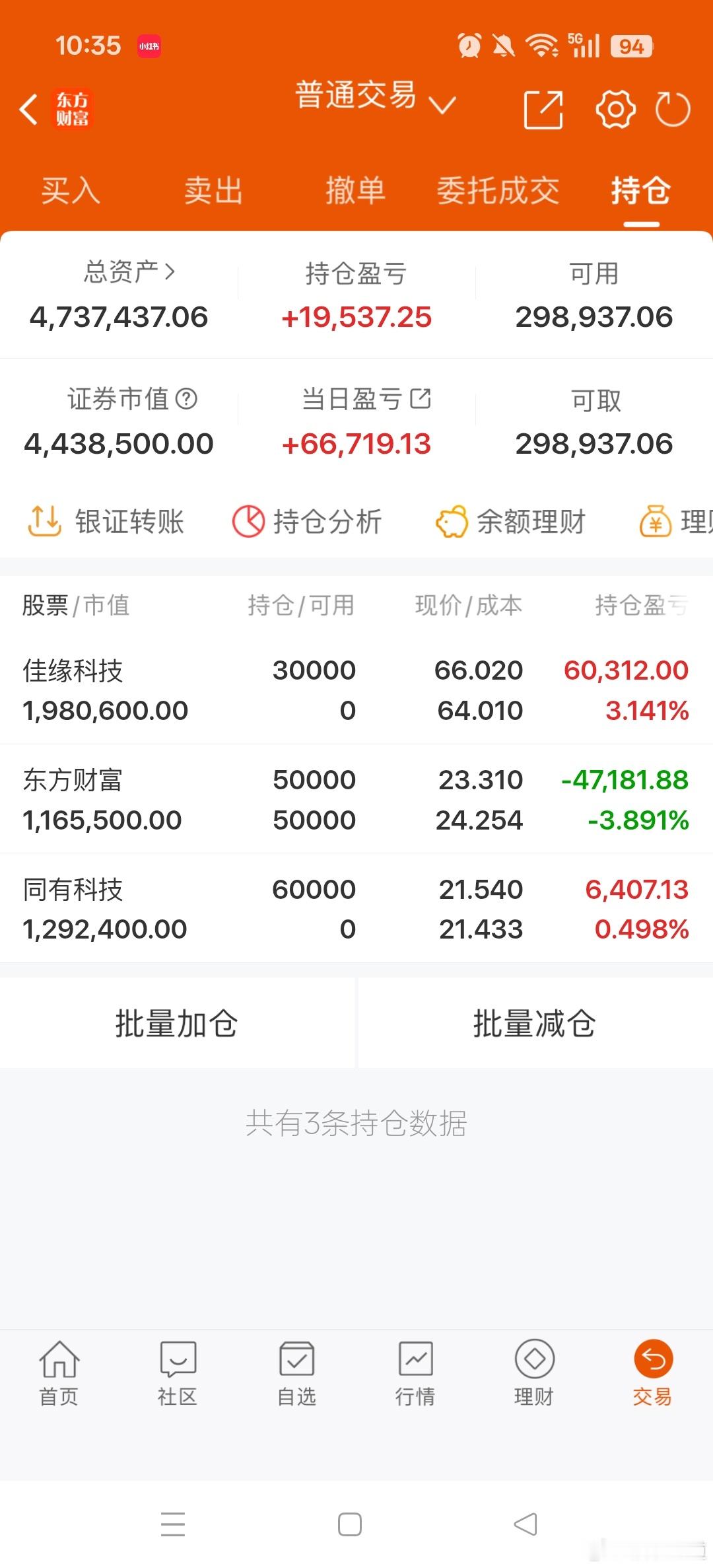 早上指数高开,然后冲高处在水上震荡盘整,同时也是小幅带量上涨的,这样的走势挺温和的,也挺安全的,大家可安心持股别乱动。从早上A股开盘的第一个30分钟来看,市场个股依然是涨多跌少普涨格局,也说明了神秘力量压不住做多的情绪,这点我们从最近几天反弹修复的过程中就能明显看见。早盘建仓同有科技,佳缘科技今日看盘股票
