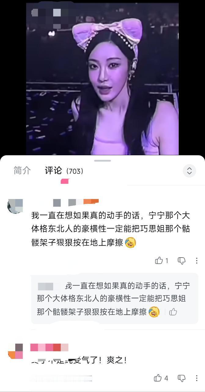 :我一直在想如果真的动手的话,宁宁那个大体格东北人的豪横性一定能把巧思姐那个骷髅架子狠狠按在地上摩擦[笑哭]