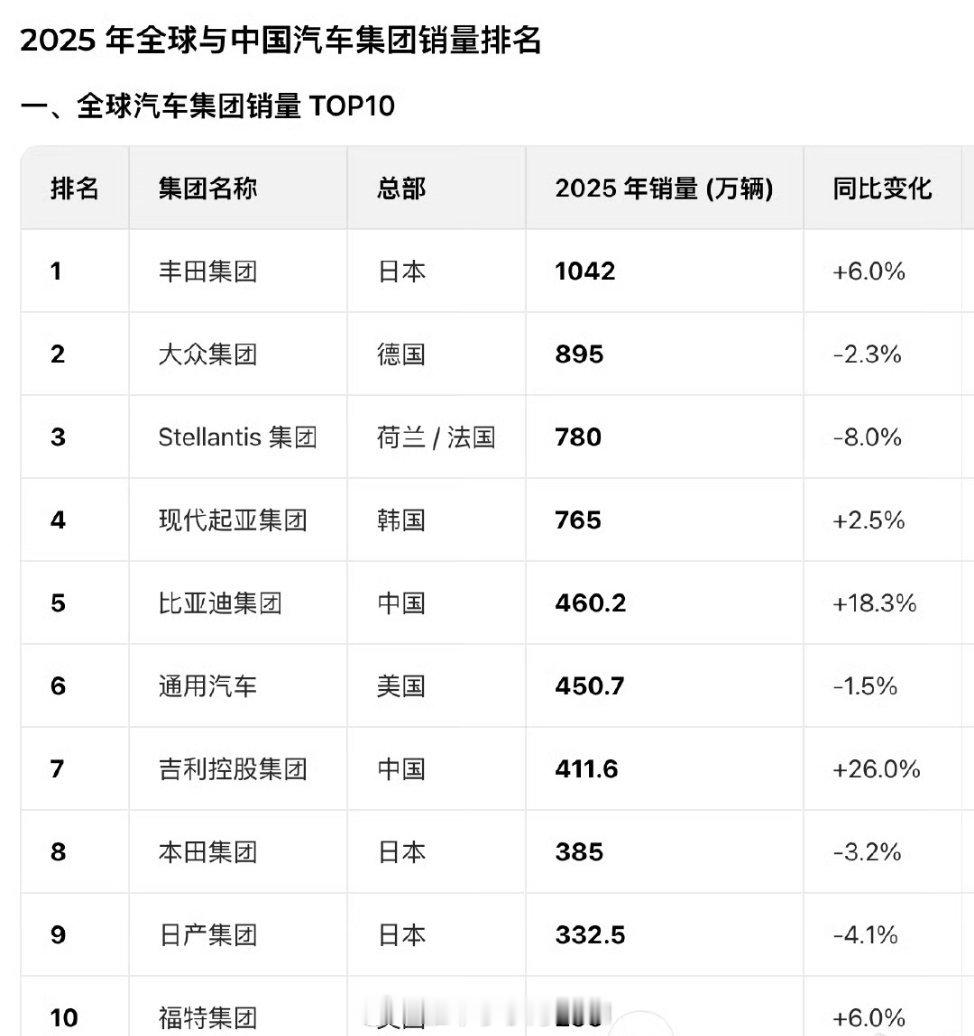 吉利控股目标2030年跻身全球前五现在来看,2025年全球各大车企销量排名第一的是丰田,虽然在网上,大家都说自主崛起,但是在全球范围内,丰田仍然大优势领先全球第一。然后是大众,Stellantis、现代起亚这些,他们的销量在全球依然坚挺。吉利预计2030年全球销量有望突破650万辆(含商用车),营收超1万亿元,将跻身全球车企销量前五。吉利目前在第7位,要花四五年时间跻身全球前五,也就是向上挤两位以上,看得出来,吉利这个目标还是比较克制的。不过650万辆的目标,按照2025年销量,正好也是排名第五。现在第五的位置是比亚迪的,比亚迪肯定也有增长目标,那只能看看能不能继续把其他车企挤下去了。大家觉得谁的位置会比较悬?汽场全开吉利