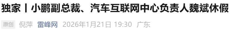 小鹏汽车再现重大人事调整!电动知家消息,1月21日,据雷峰网报道,小鹏汽车副总裁、汽车互联网中心负责人魏斌目前已处于休假状态。这一变动距产品中心副总裁陈永海离职消息披露不足半月,叠加此前自动驾驶中心负责人调整,小鹏汽车新一轮组织架构优化已全面铺开,引发行业对其战略调整的高度关注。