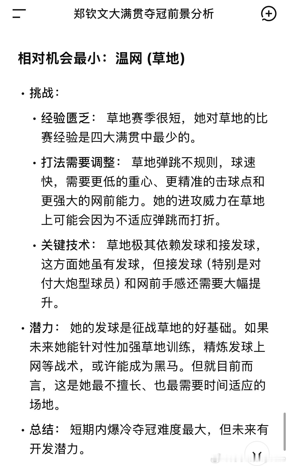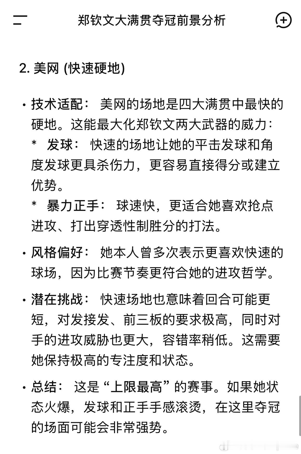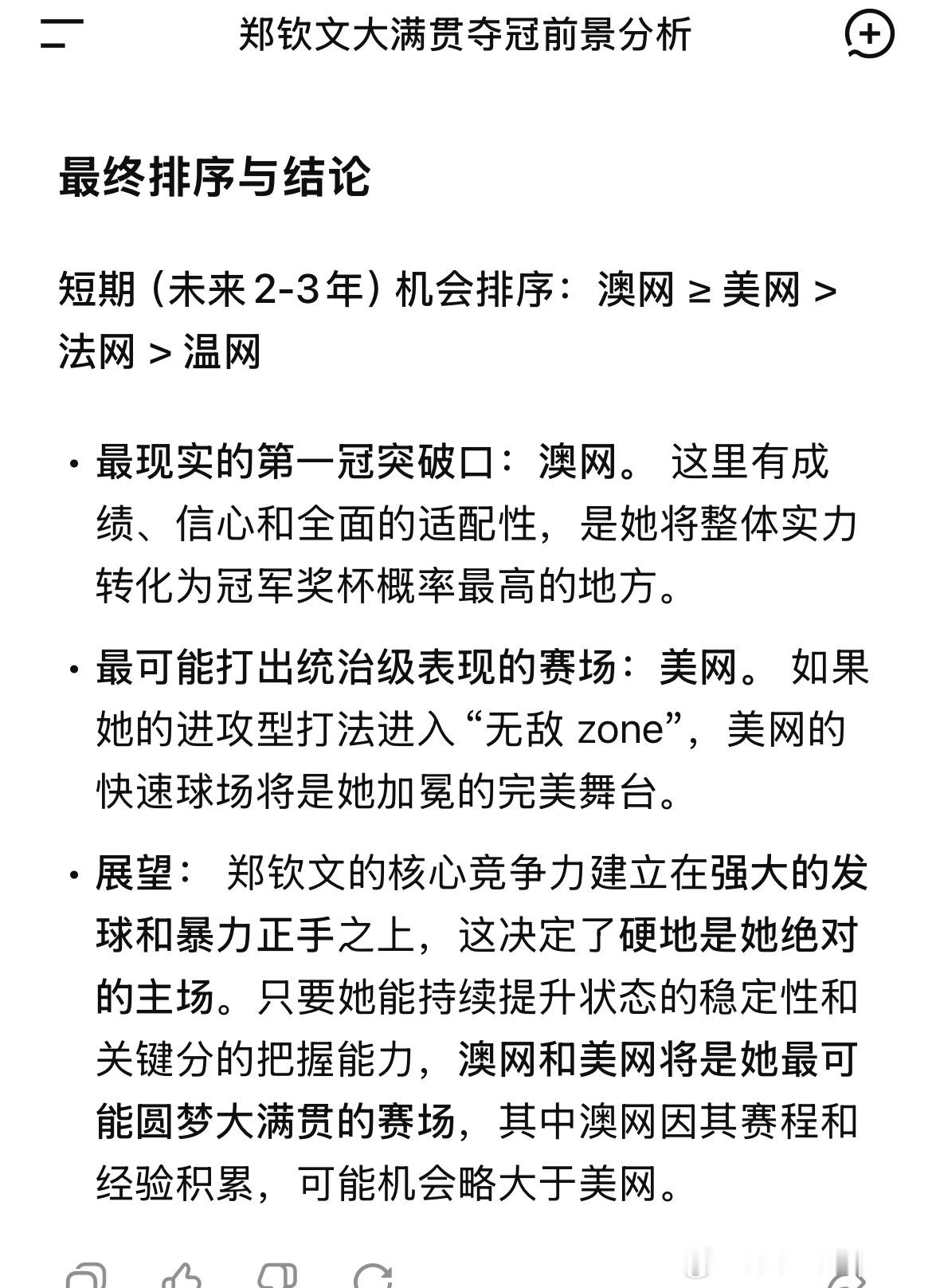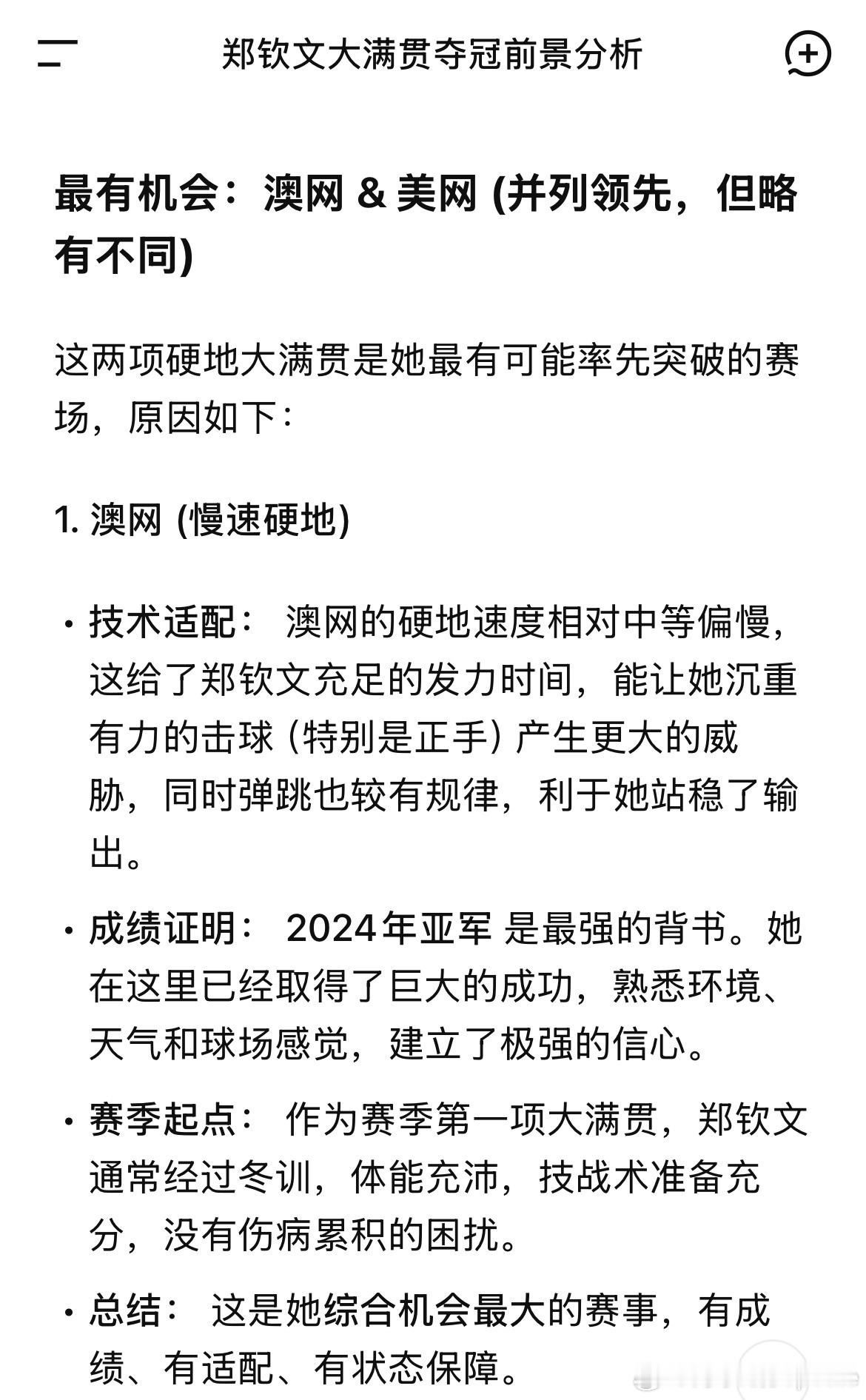 郑钦文的网友们人均用上了AI助理自从郑钦文官宣代言千问之后,我开始没事就问Ai各种预测、问题~ 比如图上对郑钦文四大满贯的分析~ 做的真不错~有人用AI生成钦文发球高光时刻的3D建模表情包,3分钟搞定以往熬大夜的应援物料;有人让AI分析赛事数据,整理出专属观赛指南;还有宝妈粉丝分享,用AI同时搞定孩子备考辅导和自己的网球训练计划,高效平衡生活与热爱。这股AI热潮的背后,正是郑钦文所传递的进取精神——用前沿方式拥抱热爱,让每一份付出都更具质感。就像郑钦文在赛场上不断突破边界,我们也在AI的助力下,让运动更高效、创作更自由、生活更精致。新的一年,不妨和千问一起,解锁属于你的科技+运动时尚日常~