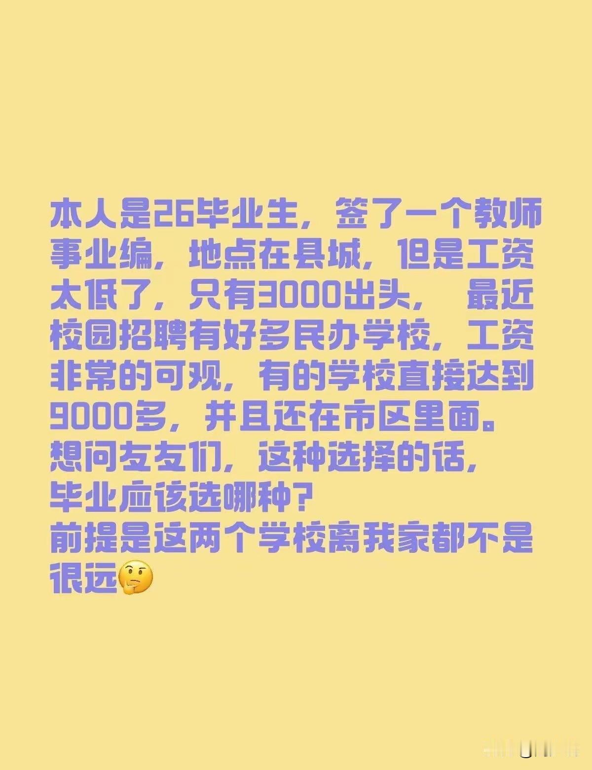 小孩子才做选择,在县城,能进去学校当一个正式编教师,虽然工资3000出头,但是工作稳定啊。去民办学校,即使给你9000一个月,那也没有任何保障。加上现在学生少,很多民办学校都找不到学生,随时都可能倒闭,随时都可能下岗。如果让你做选择,你会选择哪一个?#寻美三湘# #长沙新朋友#