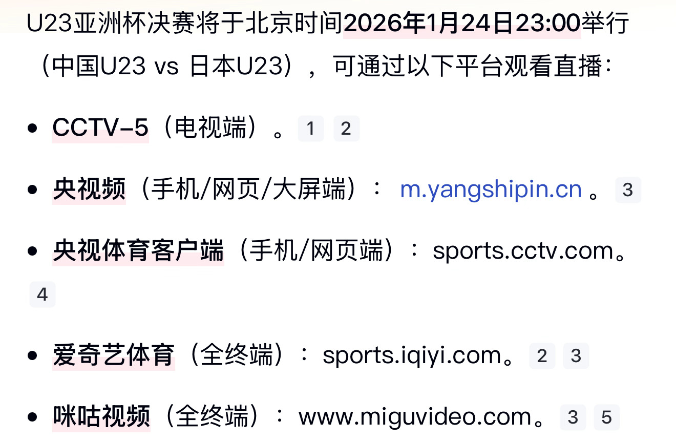 北京时间2026年1月24日23:00,U23亚洲杯决赛(中国U23 vs 日本U23),这些地方可以看直播。
