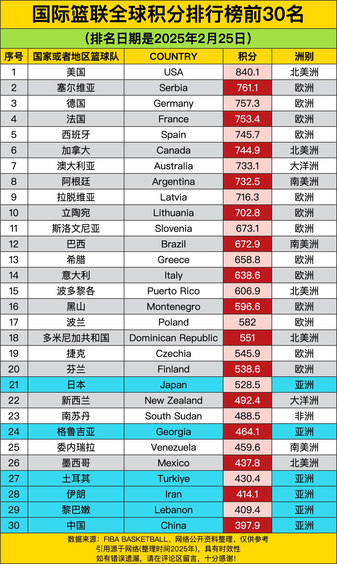 美国队一骑绝尘,840.1的积分,妥妥的“篮球霸主”啊!就像篮球界的超级巨星,别人只能在后面吃灰。人家那实力,各种大赛冠军拿到手软,球员个个都是天价身价,在篮球场上那就是降维打击,让其他队伍望尘莫及。 再瞧瞧欧洲球队,好家伙,前10名里一大半都是欧洲的。塞尔维亚、德国、法国、西班牙啥的,就跟一群厉害的小弟跟着大哥混似的。他们篮球底蕴深厚,战术体系成熟,球员技术全面。在国际赛场上,那也是横冲直撞,每次比赛都能给观众带来精彩的对决,是篮球世界里一股不可小觑的力量。 咱把目光转到亚洲,中国队排在第30位,积分397.9。哎呀呀,跟前面那些大佬比起来,确实有点差距。不过咱也别灰心呐,咱中国篮球也不是一直没进步过。只是还需要加把劲,多培养些有实力的球员,在战术上多下功夫。相信要不了多久,咱中国队也能在这个榜单上往前冲一冲,让世界刮目相看! 最后看看其他大洲的队伍,像大洋洲的澳大利亚、南美洲的阿根廷等,也都有自己的一席之地。篮球这玩意儿,真是全球都在热爱的运动,每个大洲都有自己的强队。这排行榜就像是一场篮球界的“华山论剑”,各个队伍都在这儿比拼,说不定哪天就有黑马杀出来,改变这格局呢,咱们就拭目以待吧!