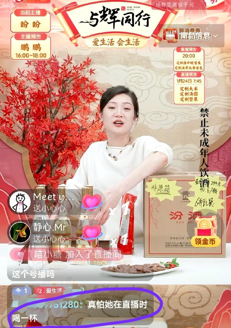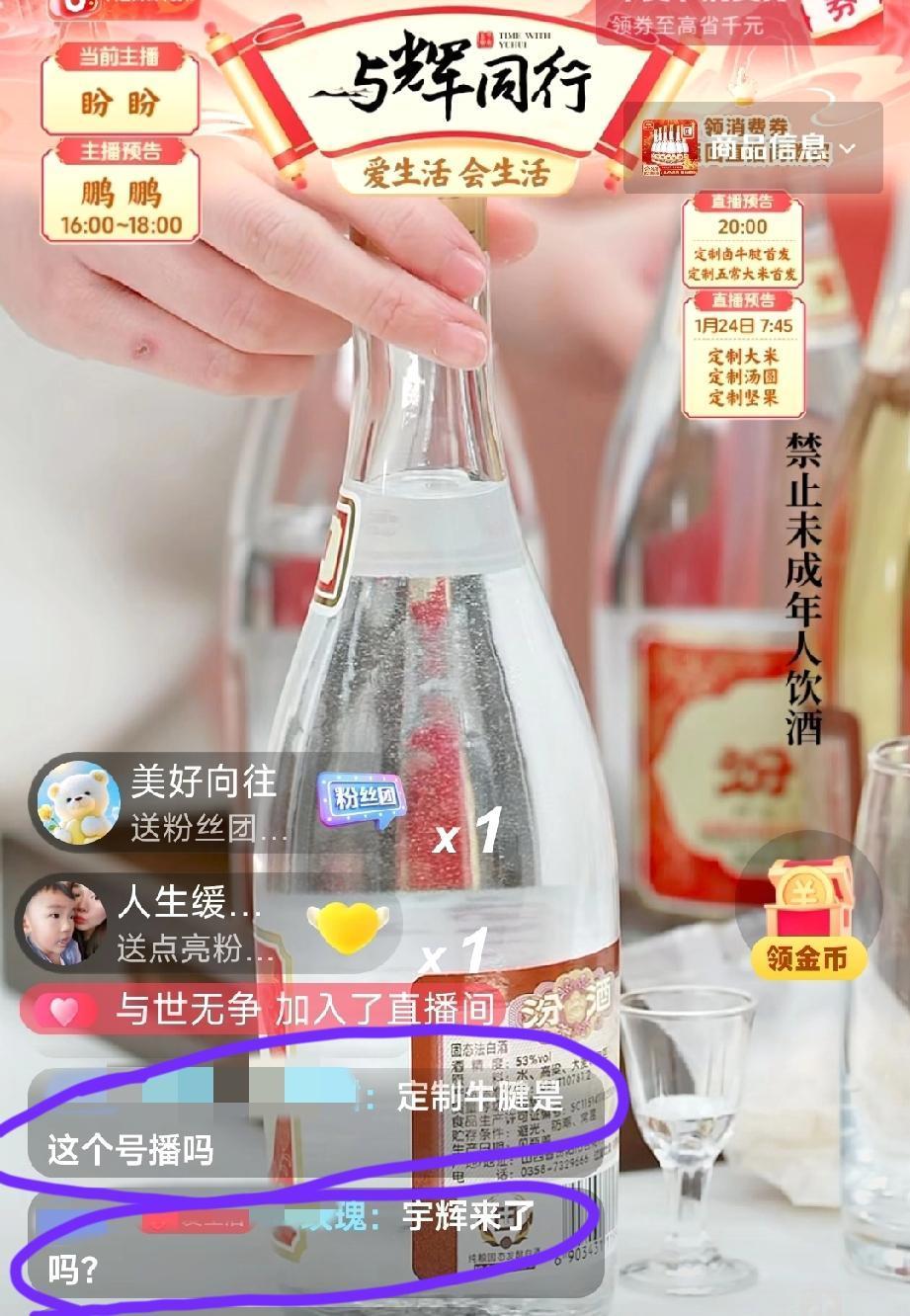 211同学们的洞察力真的是太强了!刚刚盼盼在讲汾酒时,仅是面对旁边说了句:“我感觉好长时间没看见你了。”便有网友问:“宇辉来了吗?” 还有朋友问:“定制牛腱子是这个号播吗?”这可能是新来的粉丝朋友,因为老朋友可能几天前就知道了这个信息。 盼盼说:“宇辉今天晚上8点钟会上播,今天晚上8点有定制牛腱子,大家现在可以先点点关注。” 还有很多老朋友记得盼盼上次卖酒时微醺的状态,说:“真怕她在直播时喝一杯。” 其实大家也不用担心,盼盼酒量还是很好的,盼盼也说了,微醺是为了直播效果,并没有真的喝醉。 但是对于盼盼来说,有这么多人真真切切的关心是给她,还是给她带来很多温暖的,也是最令她开心的事。 董宇辉 与辉同行