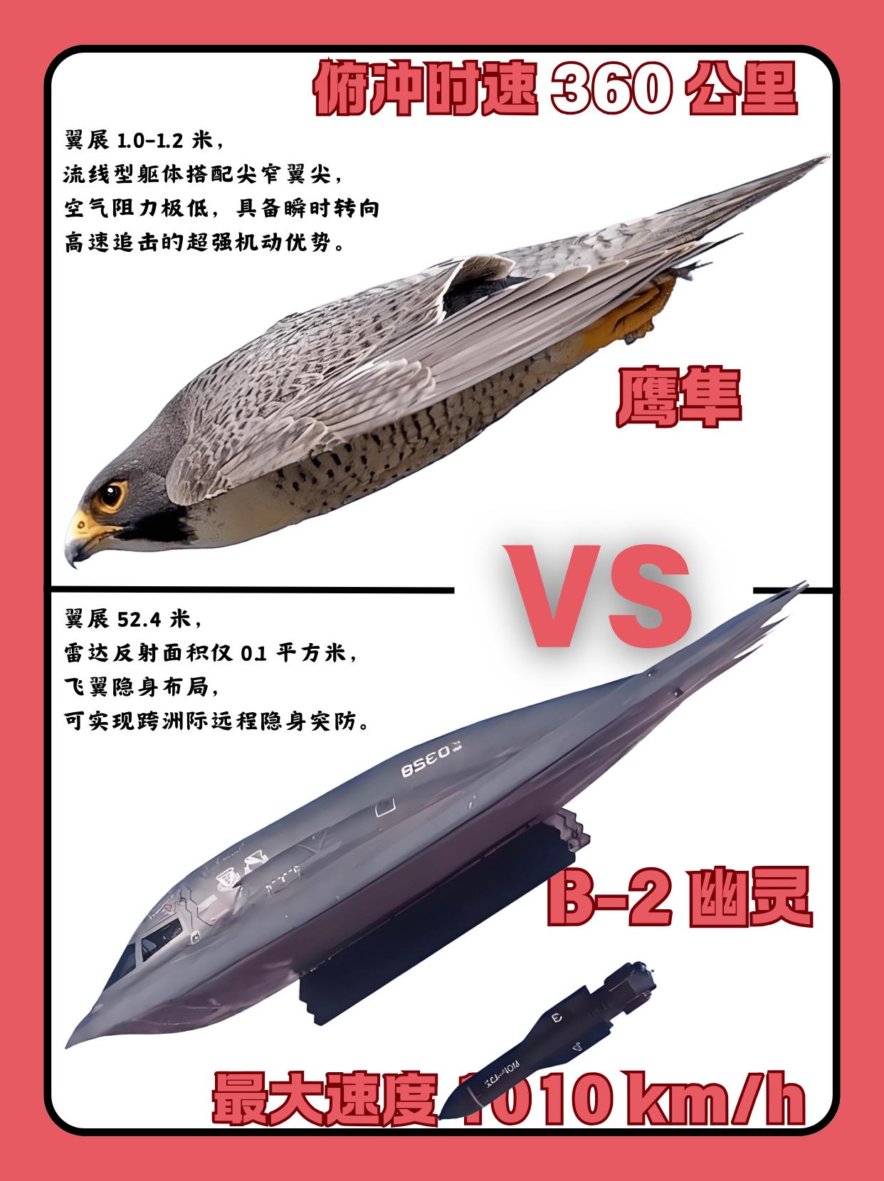 鹰隼与 B-2:自然猎手与科技工业的性能对比 从自然界的顶级猎手到人类工业的巅峰造物,是演化与科技的跨维度对话。 ①鹰隼作为自然界的高速猎手,俯冲时速可达 360 公里,翼展为 1.0-1.2 米;其流线型躯体搭配尖窄翼尖的结构,大幅降低空气阻力,具备瞬时转向、高速追击的超强机动优势。 ②B-2 轰炸机作为人类工业的产物,最大平飞速度达 1010km/h,翼展为 52.4 米;采用飞翼隐身布局,雷达反射面积仅 0.1 平方米,可实现跨洲际远程隐身突防。 仿生构造既展现自然演化的精妙适配性,也凸显人类工业科技的硬核突破力。