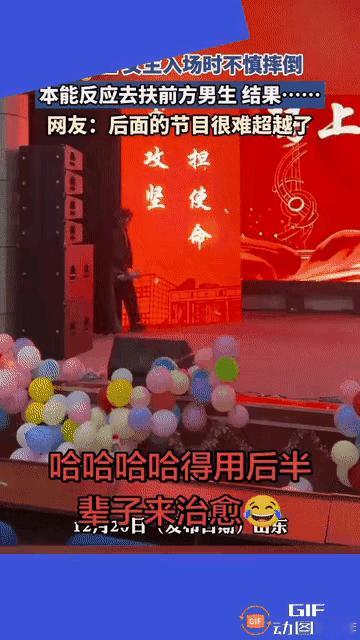 天呐!晚会上居然上演了这么让人脚趾抠地的一幕!女生入场时不小心摔了个踉跄,出于本能反应伸手去抓前方男生。 谁能想到这一抓,直接把男生的裤子给扒拉下来了,男生差点就走光,那场面要多尴尬有多尴尬,慌慌张张赶紧提裤子,这画面想想都让人忍俊不禁。 网友们也纷纷调侃:“后面的节目很难超越了。”确实,这突发状况简直成了晚会的“意外高光时刻”。而男生那句“本来出丑的是你,最后丢人的却是我”,更是道尽了内心的无奈与委屈。 其实啊,生活里这样的意外状况时有发生。很多时候,我们以为倒霉的是别人,结果最后自己却成了那个“小丑”。 但这又何尝不是生活的乐趣所在呢?这些意外就像平淡生活里的小插曲,给我们的日子增添了不少别样的色彩。 而且从这件事也能看出来,人与人之间的互动充满了不确定性。一个小小的举动,就可能引发一系列意想不到的结果。说不定这次意外,还会成为男生和女生之间一段特别的回忆呢。 你们工作生活中有没有其他有趣的经历?快来评论区分享分享,让咱们一起感受生活里这些奇妙的瞬间!