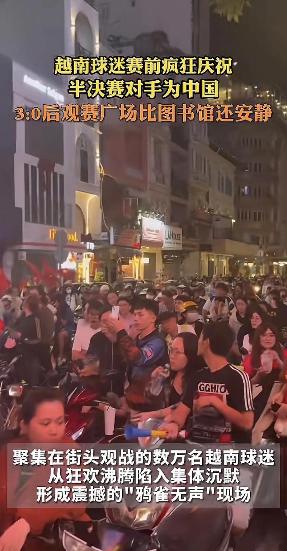 这比赛前后的场面,对比也太鲜明了!足球赛前,越南球迷那叫一个信心爆棚,在街头疯狂庆祝,就等着看自家球队在半决赛里对阵中国队的表现。 可没想到,比赛一开场,局势就一边倒。中国队连进三球,打了个漂亮的3:0。 这下可好,刚才还沸腾得像开水壶一样的越南观赛广场,瞬间安静了。数万球迷集体陷入沉默,现场鸦雀无声,安静得简直比图书馆还夸张。 从狂欢到寂静,只用了不到一场球的时间。这大概就是竞技体育最残酷也最真实的一面吧。