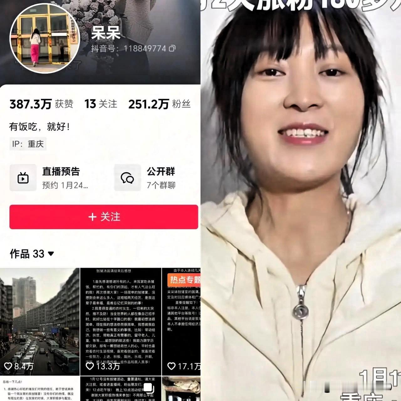 不出意外的话, 呆呆在1月24号又要火了! 不是因为她要去台湾了,而是她的主页说了,1月24号要直播,但是具体是直播什么就不知道了。 之前靠一句喊人帮忙按猪爆火,呆呆的淳朴和清醒圈粉无数,就连人民日报都点名表扬,热度最高时单场收入几百万,却果断拒绝打赏和签约,说停播就停播,这份通透比流量更难得。 如今突然官宣直播却藏着掖着,不透露半点风声,反而比直白预告更让人期待,全网都在猜她到底要干啥。 有人说她要带大家逛合川美景,毕竟现在她成了当地文旅大使,也有人猜还是熟悉的农家日常,喂猪做饭唠家常,还有人觉得会不会有惊喜福利回馈粉丝。 其实比起直播内容,大家更想看的,是这个不被流量裹挟的姑娘,到底能把这份纯粹保持多久。 我觉得呆呆这波太聪明了,不说透反而更有吸引力,比起那些使劲炒作蹭热度的网红,她的这份松弛感才是真正的流量密码。 她从不是靠套路博眼球,而是赢在真实接地气,大家喜欢的从来不是什么大场面,就是这份不加修饰的人间烟火气。 流量浮躁的当下,太多人追名逐利忘了初心,而呆呆始终守住本心,不消费粉丝温情,不辜负大家的喜欢,这份清醒才最难得。 你觉得呆呆1月24号的直播会是什么内容?她这份不贪流量的清醒,是不是网红圈里的一股清流?
