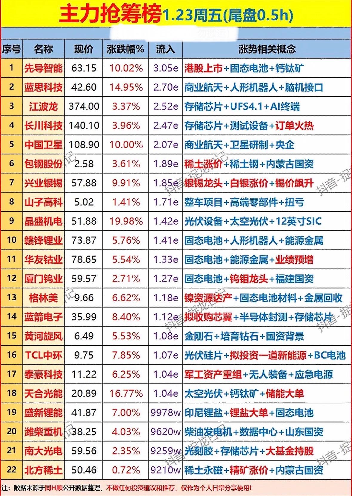 "1月23日尾盘30分钟主力抢筹榜亮点:固态电池、稀土、光伏赛道爆发,机器人概念活跃,北向资金青睐科技龙头。" 主力抢筹榜:固态电池、存储芯片、商业航天概念股受追捧,稀土、光伏、机器人板块活跃,资金聚焦热门赛道。