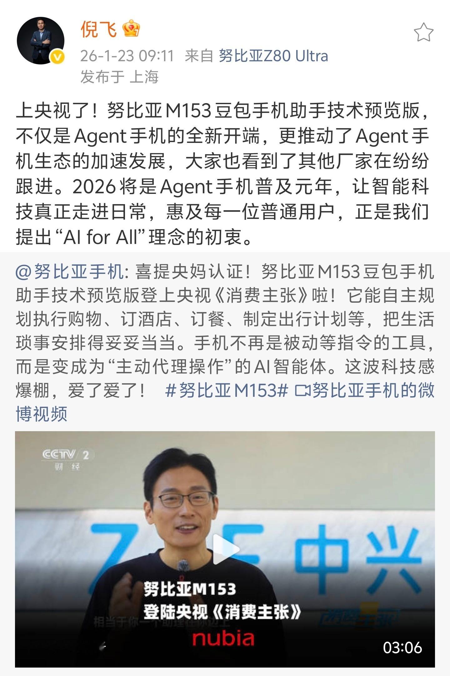 倪飞称2026是Agent手机普及元年,这话戳中行业核心趋势了!今年头部厂牌全押注AI智能体,端侧算力、跨应用调度技术都到了落地节点,中兴努比亚和豆包的合作更是打响了系统级融合的第一枪。虽还面临权限安全、成本控制等难题,但从厂商布局和技术迭代来看,手机从工具向智能伙伴转型已是定局。今年大概率会是Agent手机从概念落地到规模化普及的关键一年,值得期待!倪飞称2026将是Agent手机元年
