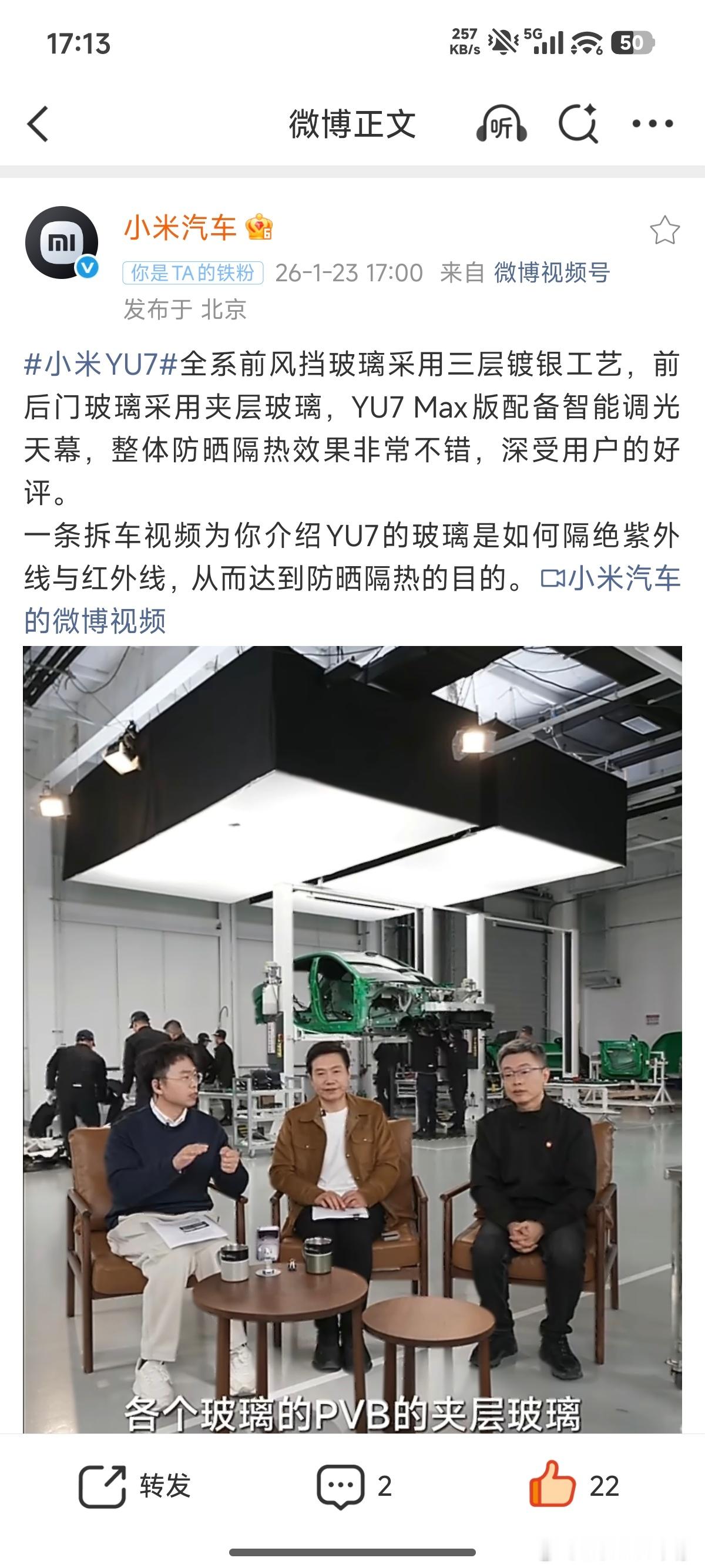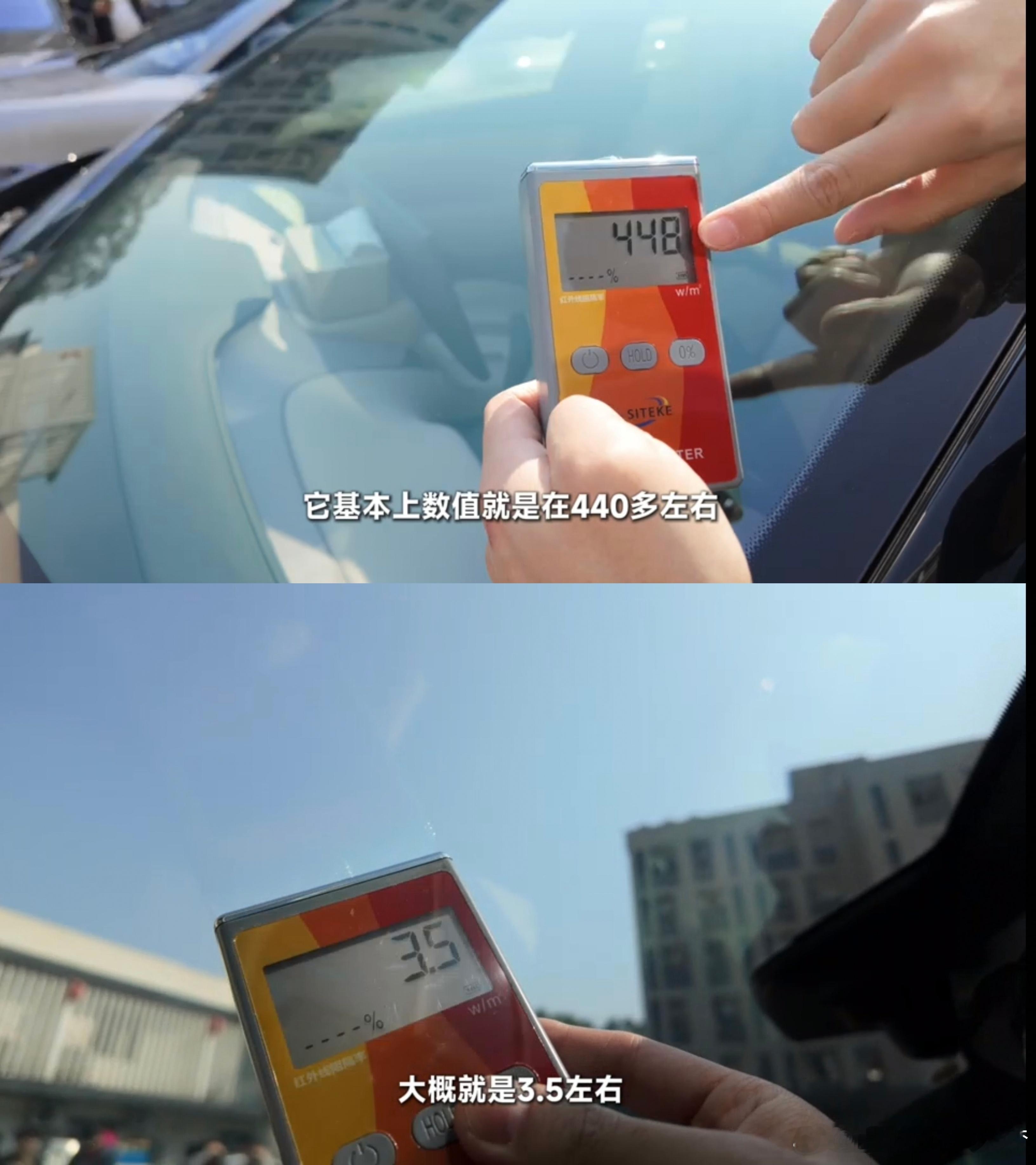 小米YU7刚刷到了小米汽车发的关于yu7前档的防晒隔热视频,正好我之前也测了个数据,大家可以参考下首先需要了解的是,热感,来源于红外线晒黑,取决于紫外线“亮”,来源于可见光我用的仪器是测红外线的,车外440左右,到车内就只有3.5了,基本上可以说效果非常显著(因为我还测了台额外贴了金属膜的车,数据大概是1.5)紫外线的当时这车上市的时候也测过,数据比较久远也懒得去找了,大家感兴趣可以直接搜内容,估计关键词也就是隔热、防晒这一类的所以我的结论是,yu7前档真的没必要贴膜可能在太热天艳阳高照的情况下你依然会觉得“亮”、“光线大”,但这其实只是可见光,并不会让你变黑可能有人会喷我“并不会让你变黑”这个观点,毕竟阻隔不是100%,但试问谁能做到100%,贴膜后也照样不能100%阻隔大v聊车