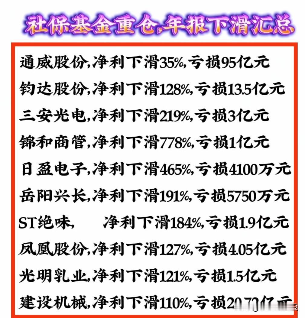 【年报业绩“暴雷”复盘】 社保基金重仓股“年报业绩”大幅下滑公司汇总。 关注“刘姥姥”,精彩分享真不少(麻烦亲们:点赞,收藏,分享)。 特别提醒:本文涉及内容及个股,仅供交流与参考,不是荐股,不得以此作为买卖依据,盈亏自负。社保概念股