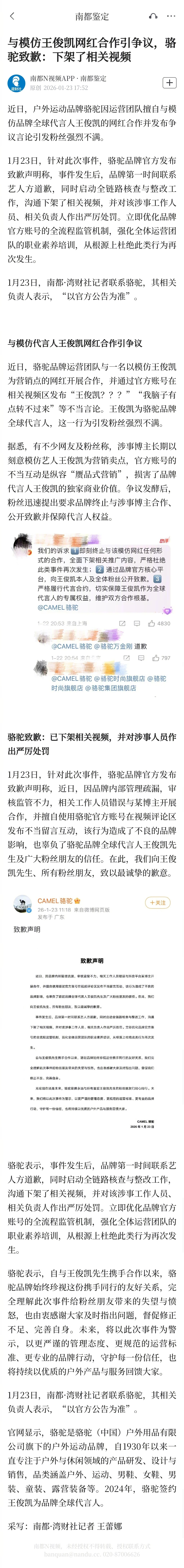 #骆驼品牌向王俊凯道歉#【与模仿王俊凯网红合作引争议,骆驼致歉:下架了相关视频】近日,户外运动品牌骆驼因运营团队擅自与模仿品牌全球代言人王俊凯的网红合作并发布争议言论引发粉丝强烈不满。1月23日,针对此次事件,骆驼品牌官方发布致歉声明称,事件发生后,品牌第一时间联系艺人方道歉,同时启动全链路核查与整改工作,沟通下架了相关视频,并对该涉事工作人员、相关负责人作出严厉处罚。立即优化品牌官方账号的全流程监管机制,强化全体运营团队的职业素养培训,从根源上杜绝此类行为再次发生。1月23日,南都·湾财社记者联系骆驼,其相关负责人表示,“以官方公告为准”。