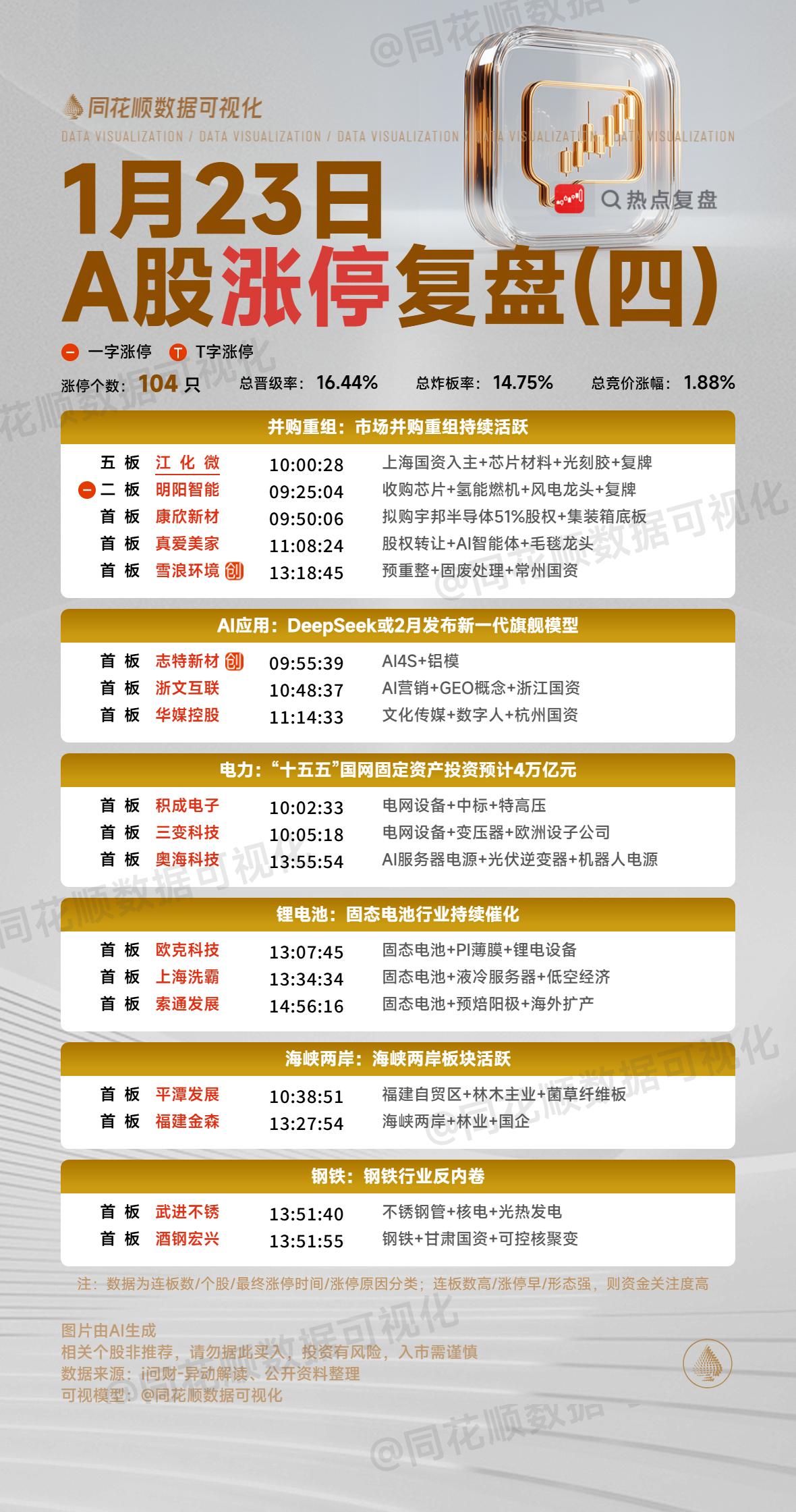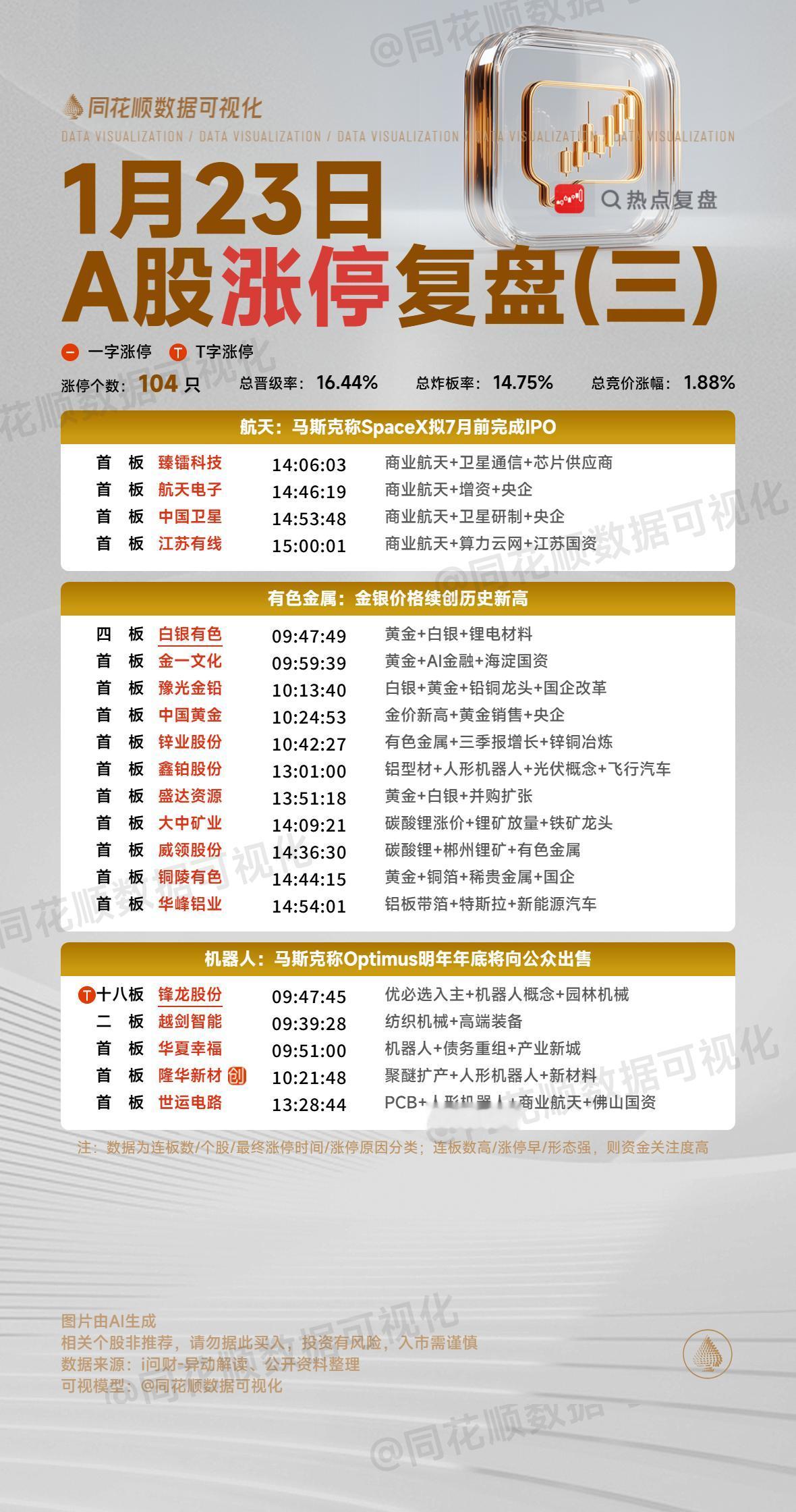 1月23日复盘:利欧股份、白银有色、国晟科技、中国长城、红宝丽隔日走势的一些看法! 今天市场的焦点在太空光伏和商业航天,这些方向一些前排个股小胖准备结合周末时间综合一起分享看法,今天更多的是对市场现阶段一些轮动方向核心个股表现的看法! 1、利欧股份(AI应用) 利欧复牌后连续两个一字跌停,今天早盘竞价出现明显翘板资金,相比于海格当初跌停翘板成交不足10亿来看,利欧竞价成交了18亿,而且它开的位置也是近跌停板,这个位置反而更适合资金去抄底,所以在情绪的带动下,它开盘就有明显的拉升,之后走出了趋势上涨,盘中一度拉高到5个点,但是最终尾盘还是回落收绿! 盘后的龙虎榜买盘多为东财席位,卖盘被套的游资集体出逃,这样的榜单在当前市场环境下太正常不过了,利欧释放出流动性对于短期持续低迷的短线情绪肯定有促进,所以今天前期两条主线商业航天和AI应用都走出了强势表现,利欧是起到了一个定海神针作用的,这样的话,虽然榜单看上去散户居多,但是另外一层涵义也可以理解为市场的合力,所以隔日利欧有继续调整的预期,但是之后的调整更多的会是良性的洗盘,反而整体风险性不会特别大了,但是今天抄底的获利盘还是非常多的,如果AI应用不是超强表现,隔日水下洗盘会是大概率的! 2、白银有色(白银) 毫无疑问白银期货的表现是非常逆天的,而且昨天沪银夜盘也是大涨的,再加上日盘同样维持趋势上行,所以有色涨停价开盘后虽然有分歧,但是最终还是因为期货强势而在早盘彻底封死涨停,走出了强势的4连板形态! 盘后的龙虎榜是3日榜,很明显是量化持续引导的连板,这样的表现就特别明显了,但是今天湖南触发了严重异动,白银也到了近期换手板的5板压制,所以隔日白银再走持续性就特别难了,除非白银期货继续大涨,毕竟期货如果持续逆天表现对于个股的带动作用巨大! 3、国晟科技(光伏) 国晟昨天完成地天板,今天早盘竞价跌停价开盘,但是成交了1.82亿,而且开盘后就出现了强势拉升,毕竟它也是光伏方向个股,午后一度冲高到9个多点,最终尾盘出现了明显回落,最终收涨3个多点! 盘后的龙虎榜买盘多为东财席位,卖盘则是昨天抄底资金大幅获利潇洒离场,这样的榜单同样是意料之中的,国晟今天能走出如此表现和光伏整体强势不无关系,而做多资金很多都是市场合力追涨的散户,今天的实际换手和昨天类似,相当于资金再一次出现了置换,而且它今天其实大部分资金其实是成交在水上,相比于利欧的获利盘要少很多,再加上光伏隔日得持续性会比AI应用强,国晟隔日或许表现不会太差,至少大幅杀跌的概率很小! 4、中国长城(CPU) 长城昨天尾盘抢筹,但是今天竞价的大幅低开就是明显不及预期了,再加上开盘后CPU整体情绪调整,长城开盘就是明显的下杀表现,之后在6个点位置持续有支撑,最终尾盘也是收跌6个点附近! 盘后的龙虎榜买盘同样是东财席位居多,中信安徽分是唯一上榜的游资席位,卖盘前滩大道和东亚苏州分大幅卖出,另外两个卖盘是量化和机构,这样的榜单是明显的游资割肉离场,这样的情况最近经常出现,游资越多的榜单反而资金砸盘欲望越大,长城昨天的控龙虎榜明显是游资所为,没想到最终成了一个这样的结局,有CPU板块整体弱势的原因,也和上头对游资的打压非常有关系,这样的话长城盘后的榜单反而并不算差,毕竟它今天没有趁弱势去补缺口就是强势的表现,隔日一旦CPU出现修复,长城走出反转是大概率,所以从情绪上看,长城隔日走出修复的概率还是非常大的! 5、红宝丽(化工) 红宝丽昨天走出了明显的拉升回落,今天早盘情绪低开后在开盘是有资金承接拉升的,并且在早盘很快拉升红盘,但是昨天的最高点有明显的强压力,之后开始明显回落,尾盘甚至直接翻绿,最终再次走出了一个冲高回落的走势! 盘后的龙虎榜3个机构入场接力,买盘还有量化,卖盘银河绍兴和学院南路两个游资席位止盈离场,这样的榜单再当前的市场就是非常好了,机构和量化引导的榜单往往能够走出趋势性,红宝丽辨识度非常高,而且连续3个交易日高换手,说明机构和量化是明显持续引导做T的,一旦化工方向开始有板块效应,红宝丽就会有超强表现,就算板块相对较弱,红宝丽至少每天都有资金承接去出现高振幅,这反而是短线最值得持续做T的,所以对于红宝丽来说,只要量能能够持续维持在高位,它大概率会等到板块共振再次强势的二波表现! 本文只限于分享和交流,不构成投资建议,股市有风险,投资需谨慎!