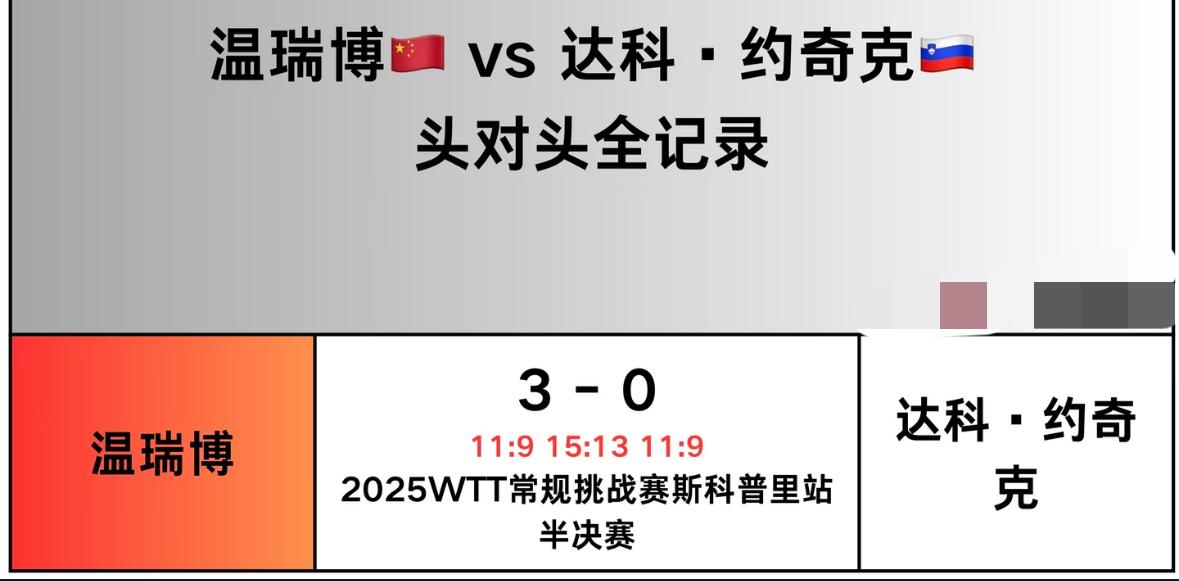 小将温瑞博与达科的头对头记录—马斯喀特男单半决赛对阵 温瑞博VS达科! 从温瑞博与达科的头对头记录 来看, 温瑞博在2025年斯科普里站, 3:0达科! 年轻小将在关键分能扛下来, 就是好样的, 温瑞博拿起拍子抡起来, 做好打五局的准备, 小将半决赛加油, 争取和陈垣宇会师决赛, 看温瑞博的比赛, 总是热血沸腾, 敢打敢拼的拼搏精神让人眼前一亮, 国乒男队又行了! 多哈球星挑战赛憾负周启豪, 这一站加油! 温瑞博—-国乒精神打出来, 未来可期啊!
