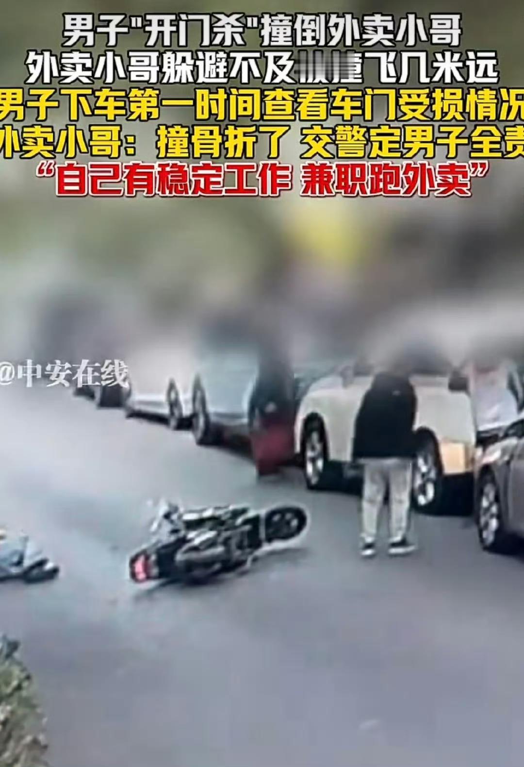 “开门杀”撞飞外卖员后先看车门,这事儿听着就让人火大。一辆私家车刚靠边停稳,司机连后视镜都没怎么瞄,左手推门“啪”一下,整扇门像镰刀似的横砍出去。后面骑电动车的小哥根本来不及刹,连人带车被掀翻,头盔飞出一道弧线,外卖箱“哐”砸在地上,汤汁洒得满地都是。可那司机第一反应不是蹲下去看人,而是绕到副驾那头,先检查自家车门有没有掉漆,嘴里还嘟囔“这得花多少钱修”。那一刻,路人全愣了:原来在有些人眼里,金属凹坑比一条命更金贵。 外卖员躺在地上,动不了,手机还在响,平台自动派单的女声一句接一句“您有新的订单,请及时取餐”,听得人心酸。他挣扎着想爬起来,胳膊一软又趴回去,蓝色制服后背磨出大洞,血珠顺着指缝往下滴。旁边大姐看不下去,冲司机吼:“先打120啊!”司机这才抬头,一脸懵:“我保险全,不怕。”好像保险能立刻把疼和骨折都报销掉似的。 “开门杀”听着像网络热词,其实就是典型的“突然开门妨碍其他车辆通行”,交通法规里写得清清楚楚:全责。可现实中总有人把车门当自家客厅门,想开就开。外卖员每天赶时间,电动车骑在非机动车道上,速度二三十,真撞上就是肉包铁,飞出去三五米算轻的。去年山西就有个例子,外卖员被推门撞倒,脑袋直接磕在马路牙子,当场重度颅脑损伤,司机却先拍照发朋友圈说“今天倒霉,遇到个骑飞车的”。 外卖员多数没签正式劳动合同,出了事平台先问“是不是众包”,一句“非雇佣关系”就能把责任推得干干净净。医疗费、误工费、营养费,全靠交警认定和司机保险慢慢磨。有的小哥躺半个月,房贷、奶粉钱全靠信用卡硬撑;有的怕超时扣钱,瘸着腿还去取餐,结果二次摔伤。网上有人喷“外卖员闯红灯该长记性”,可一码归一码,守规矩在非机动车道骑,被“开门杀”撞飞,难道也怪他? 就两个动作能救命:司机停车先反手摸门,用“荷式开门”强迫身体扭过去,眼睛自然扫到后视镜;骑车的离门一米五,俗称“开门安全区”,速度慢一点,手指搭刹车。别小看这一秒,生死就差这一秒。可惜很多人嫌麻烦,觉得“我技术好”“我运气不会那么背”,真撞上就晚了。 交警到场,判司机全责,保险员拍照,救护车呼啸。外卖员被抬上担架前还惦记着餐箱:“里面还有两单,客人得饿肚子了。”司机这时候才低声说了句“对不起”。可网友不买账:要是先看人再看门,这句对不起才值钱。屏幕外,我们每天点外卖、开车门,谁能保证下一次不是自己去躺那冰冷的路面?先有人,才有车;先有爱,才有路。记住先看后视镜,再开门,那一眼也许就能留住一个家的顶梁柱。送外卖事故 外卖员翻车事故 开杀门 来源:中安在线