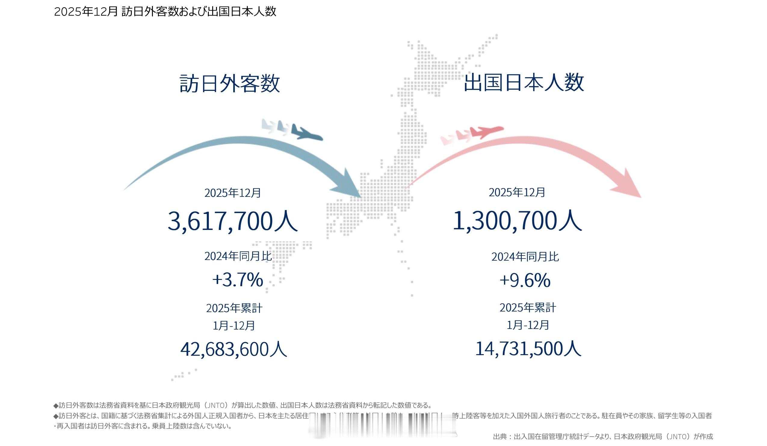 访日游客首破4000万 日本公布去年12月和2025全年游客数据去年12月中国内地访日游客数量为33.04万人次,比上年同期大幅下降45.3%。去年12月访日游客总数为361.77万人次,比上年同期上涨3.7%;2025全年访日游客总数为4268.36万人次,比上年同期上涨15.8%。