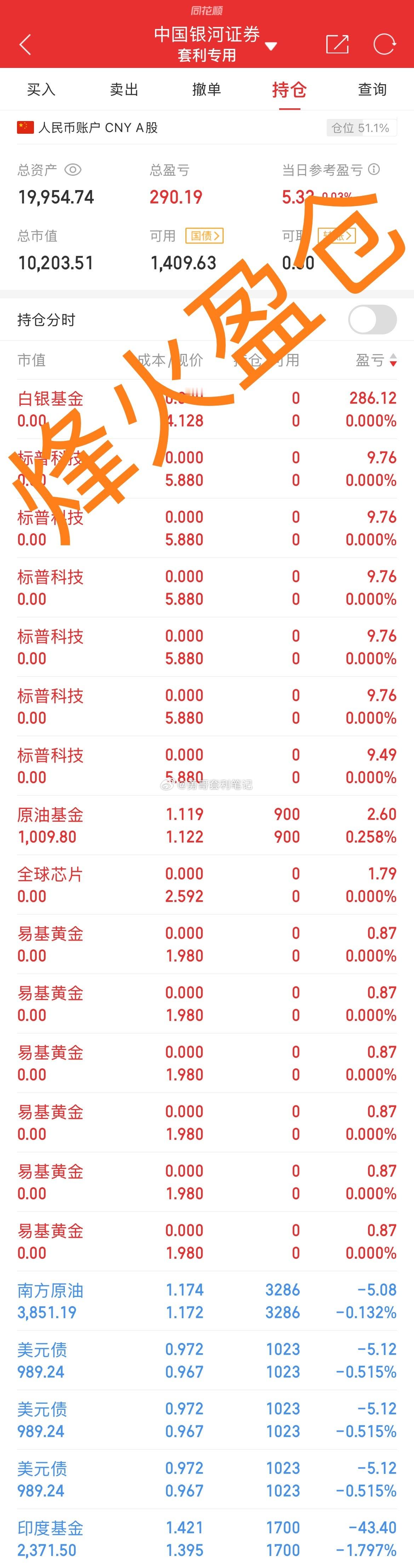 套利 今套利四只,海外科技 501312溢价率2%+,限额100,我小拖拉机按单账号1000申购了,试试能不能成功,稳妥的是场外申购100。清仓盈利的和限额10的🥲实盘贴图仅作为个人记录之用,不构成任何投资建议及操作指引!盈亏自负,切勿盲目跟风!基金