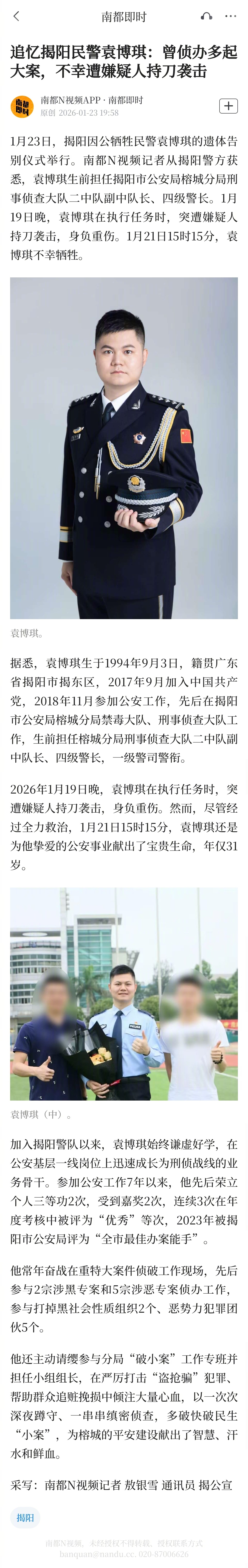 【#追忆揭阳民警袁博琪#:曾侦办多起大案,不幸遭嫌疑人持刀袭击】1月23日,揭阳因公牺牲民警袁博琪的遗体告别仪式举行。南都N视频记者从揭阳警方获悉,袁博琪生前担任揭阳市公安局榕城分局刑事侦查大队二中队副中队长、四级警长。1月19日晚,袁博琪在执行任务时,突遭嫌疑人持刀袭击,身负重伤。1月21日15时15分,袁博琪不幸牺牲。据悉,袁博琪生于1994年9月3日,籍贯广东省揭阳市揭东区,2017年9月加入中国共产党,2018年11月参加公安工作,先后在揭阳市公安局榕城分局禁毒大队、刑事侦查大队工作,生前担任榕城分局刑事侦查大队二中队副中队长、四级警长,一级警司警衔。2026年1月19日晚,袁博琪在执行任务时,突遭嫌疑人持刀袭击,身负重伤。然而,尽管经过全力救治,1月21日15时15分,袁博琪还是为他挚爱的公安事业献出了宝贵生命,年仅31岁。加入揭阳警队以来,袁博琪始终谦虚好学,在公安基层一线岗位上迅速成长为刑侦战线的业务骨干。参加公安工作7年以来,他先后荣立个人三等功2次,受到嘉奖2次,连续3次在年度考核中被评为“优秀”等次,2023年被揭阳市公安局评为“全市最佳办案能手”。他常年奋战在重特大案件侦破工作现场,先后参与2宗涉黑专案和5宗涉恶专案侦办工作,参与打掉黑社会性质组织2个、恶势力犯罪团伙5个。他还主动请缨参与分局“破小案”工作专班并担任小组组长,在严厉打击“盗抢骗”犯罪、帮助群众追赃挽损中倾注大量心血,以一次次深夜蹲守、一串串缜密侦查,多破快破民生“小案”,为榕城的平安建设献出了智慧、汗水和鲜血。采写:南都N视频记者 敖银雪 通讯员 揭公宣