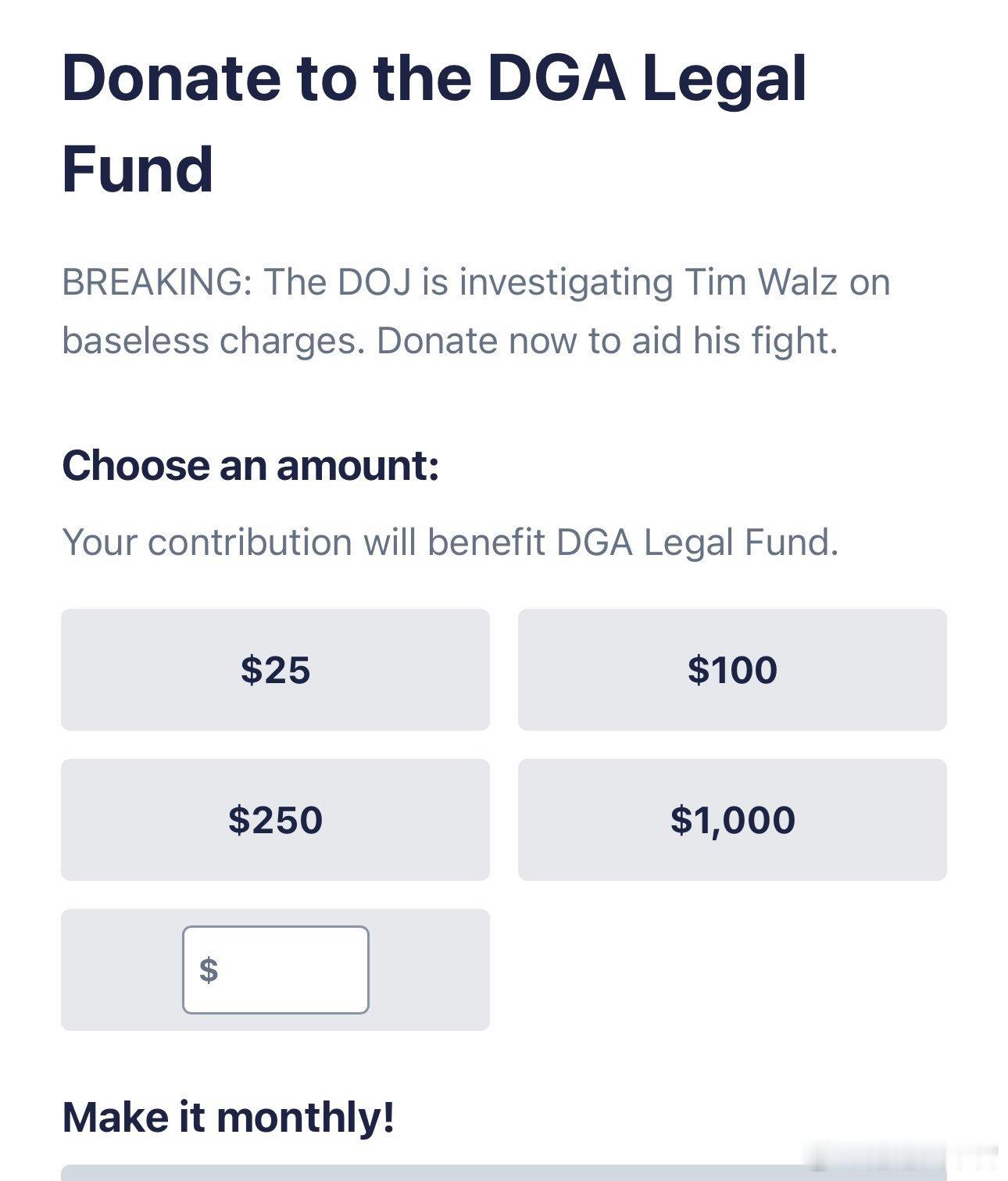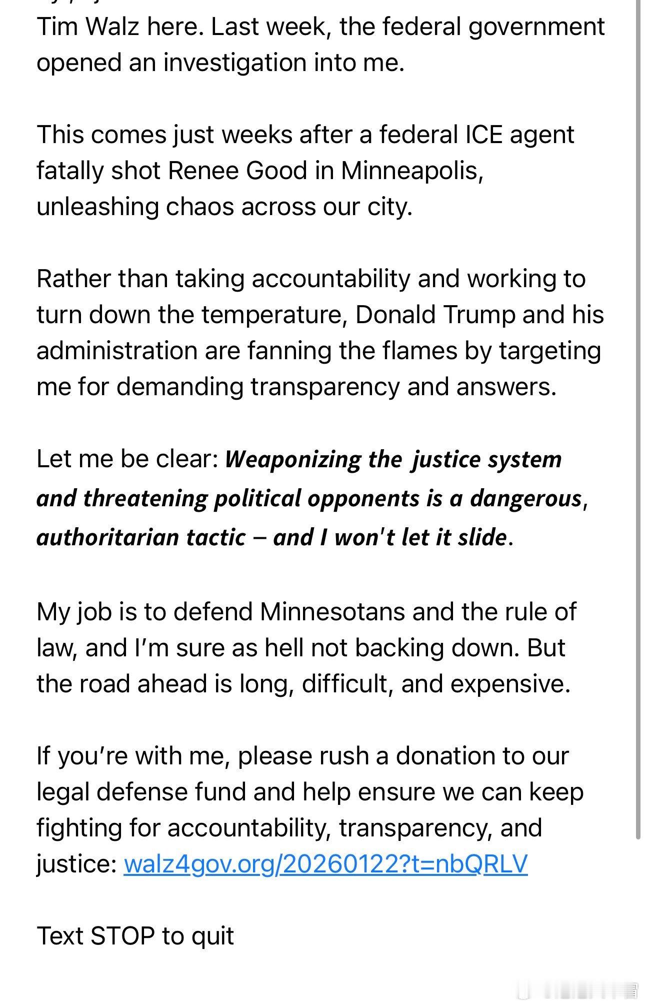 明尼苏达州长蒂姆·沃尔兹正在为其法律辩护基金筹款。“上周,联邦政府对我发起了调查......如果你支持我,请尽快向我们的法律辩护基金捐款,帮助我们继续为问责制、透明度和正义而战。”海外新鲜事海外新鲜事美司法部对明尼苏达州长发起刑事调查