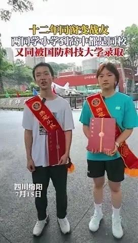 四川绵阳,一男生被国防科技大录取,可就在他去取通知书时,竟看到同校女同学也在,而女生也同样被国防科技大录取了!要说最神奇的是,二人从小学到高中,一直都是同学,简直就是缘分!网友:连小说都不敢这么写! 2025年7月,四川绵阳中学上演现实版“缘分天注定”:同窗12年的石锟垚与邓惜文同时领取国防科技大学录取通知书。 石锟垚那天特意穿了件洗得发白的校服,手里攥着身份证,脚步都透着雀跃。刚走进学校招生办,就瞥见熟悉的身影——邓惜文正低头核对信息,阳光透过窗户落在她肩头,让她手里那份红色通知书格外耀眼。“邓惜文?”他下意识喊了一声,女生回头,眼里瞬间闪过惊讶,随即笑开:“石锟垚!你也来取通知书?”两人几乎同时举起手里的信封,红色封面上“国防科技大学”六个烫金大字,在阳光下熠熠生辉,连落款的日期都一模一样。 周围取通知书的同学和家长都围了过来,有人认出他们:“这不是咱们学校的‘神仙同桌’吗?从小学就一起上学,现在居然考去同一所军校!”这话一点不假,石锟垚和邓惜文的缘分,要从小学一年级说起。当时班主任按身高排座位,两人一左一右坐在第一排,从此成了形影不离的伙伴。小学时一起跳皮筋、抄作业,初中时组队参加物理竞赛,高中更是被分到同一个实验班,连晚自习的座位都隔着一条过道,抬头就能看到彼此刷题的身影。 最巧的是,两人的军校梦都萌芽于初中。那年国防科大的招生宣讲团来绵阳中学开展科普活动,他们一起组装“梦天一号”模型火箭,看着火箭腾空而起的瞬间,石锟垚指着天空说“以后我要去搞航天工程”,邓惜文则握紧拳头回应“我要研究国防科技”。从那天起,两人就成了互相监督的“战友”,每天比着早起晨读,晚自习后留在教室复盘错题,就连高考志愿填报,都是各自在家熬夜查资料,却不约而同地在第一志愿栏填了国防科技大学。 国防科大作为军中顶尖学府,录取门槛向来严苛。2025年在四川的物理类录取线高达649分,位次要冲进全省3636名以内,还要通过严格的体检和政审。石锟垚的高考成绩超出录取线12分,邓惜文更是以超出15分的高分入围,这样的成绩背后,是十二年如一日的并肩奋斗。高中冲刺阶段,石锟垚的数学偶尔拖后腿,邓惜文就把自己的错题本借给他,用不同颜色的笔标注解题思路;邓惜文的体能测试差点不达标,石锟垚就每天陪她晨跑,监督她做仰卧起坐,直到她顺利通过军校体检。 取通知书那天,两人的父母也赶来了学校。邓妈妈看着两个孩子手里的通知书,眼眶泛红:“从小学就看着他们一起长大,一起努力,现在能去同一个学校,真是太圆满了!”石爸爸则拍着儿子的肩膀,语气骄傲:“国防科大近五年收了125个绵中学子,他们能成为其中一员,还能继续做同学,这既是缘分,更是实力。”周围的老师也纷纷打趣,说两人这是“从校服到军装的约定”,未来还要在国防科大的校园里继续当同窗。 这段奇缘被同学拍下视频发到网上,很快冲上热搜。网友们纷纷留言:“这缘分简直逆天了,十二年同窗加同校同专业,小说都不敢这么写”“优秀的人总会互相吸引,既是同学也是战友,未来可期”“绵阳中学果然厉害,能培养出这么多顶尖军校生,国防教育氛围太浓了”。还有网友翻出当年两人参加火箭组装活动的照片,感慨“原来缘分早就埋下伏笔,少年时的梦想真的能一起实现”。 其实这份看似偶然的缘分,藏着必然的坚守。十二年同窗,他们不仅是彼此的见证者,更是共同成长的同行者;选择国防科大,不仅是分数的契合,更是报国志向的共鸣。国防科大与绵阳中学多年来“大中衔接”的育人模式,让科技报国的种子在学子心中生根发芽,而石锟垚与邓惜文的故事,正是这种教育理念结出的硕果。 青春最美的模样,莫过于与志同道合的人并肩前行,朝着同一个目标努力。他们的故事告诉我们,缘分是锦上添花的惊喜,而实力才是逐梦路上最坚实的底气。未来,当两人穿上军装,在国防科大的校园里继续深造,这份跨越十二年的同窗情,终将化作保家卫国的共同担当。 各位读者你们怎么看?欢迎在评论区讨论。