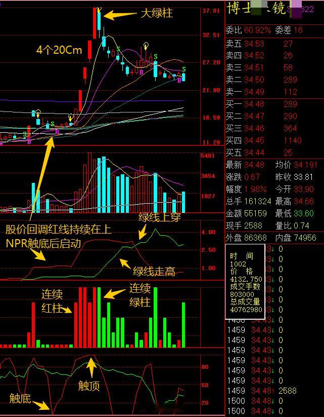操纵67个账户被罚没超10亿 余韩操纵证券市场被罚没超10亿,浮出了其做庄博S眼镜的经过。快速拉升前,先出一根大红柱,然后股价回调整理,但是整理期间红线持续在上,不受股价回调影响。这就是模主一直强调大家要注意的模式,因为这种信号,往往说明是主力、庄家在做拉升前的洗盘。然后等NPR触底,再重新出较好红柱信号。这票基本也是这样动作,NPR触底后,股价小幅走高,然后出大红柱信号,股价快速拉升,连拉了4个20Cm大板,不能不说,这个主力手法的确非常凶悍。出货也非常果断,NPR触顶后出大绿柱后就走了,按公告应该是8月26日出完,而这里正好出了六根大绿柱,他出完,大绿柱也结束了。所以,通过这个案件,说明榜主的指标,还是非常精准的反应这个主力的运作过程,大家要好好体会,从中来提高自已的看盘能力。