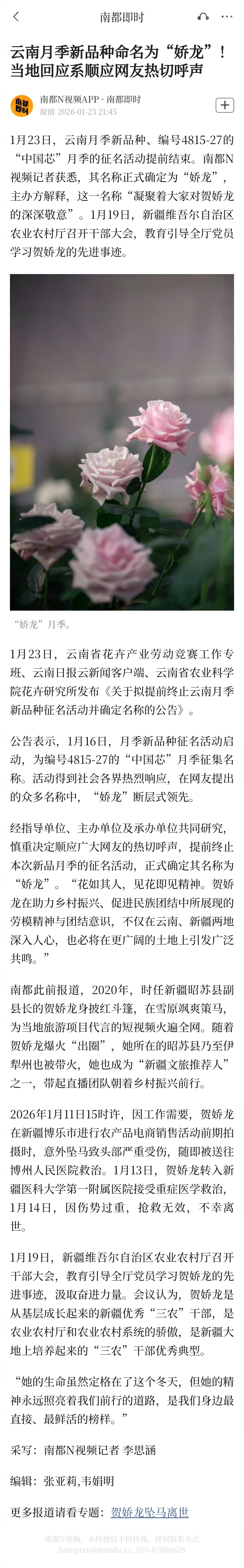 #云南月季新品种命名为娇龙#【云南月季新品种命名为“娇龙”!当地回应系顺应网友热切呼声】#当地回应月季新品种命名为娇龙#1月23日,云南月季新品种、编号4815-27的“中国芯”月季的征名活动提前结束。南都N视频记者获悉,其名称正式确定为“娇龙”,主办方解释,这一名称“凝聚着大家对贺娇龙的深深敬意”。1月19日,新疆维吾尔自治区农业农村厅召开干部大会,教育引导全厅党员学习贺娇龙的先进事迹。1月23日,云南省花卉产业劳动竞赛工作专班、云南日报云新闻客户端、云南省农业科学院花卉研究所发布《关于拟提前终止云南月季新品种征名活动并确定名称的公告》。公告表示,1月16日,月季新品种征名活动启动,为编号4815-27的“中国芯”月季征集名称。活动得到社会各界热烈响应,在网友提出的众多名称中,“娇龙”断层式领先。经指导单位、主办单位及承办单位共同研究,慎重决定顺应广大网友的热切呼声,提前终止本次新品月季的征名活动,正式确定其名称为“娇龙”。“花如其人,见花即见精神。贺娇龙在助力乡村振兴、促进民族团结中所展现的劳模精神与团结意识,不仅在云南、新疆两地深入人心,也必将在更广阔的土地上引发广泛共鸣。”
