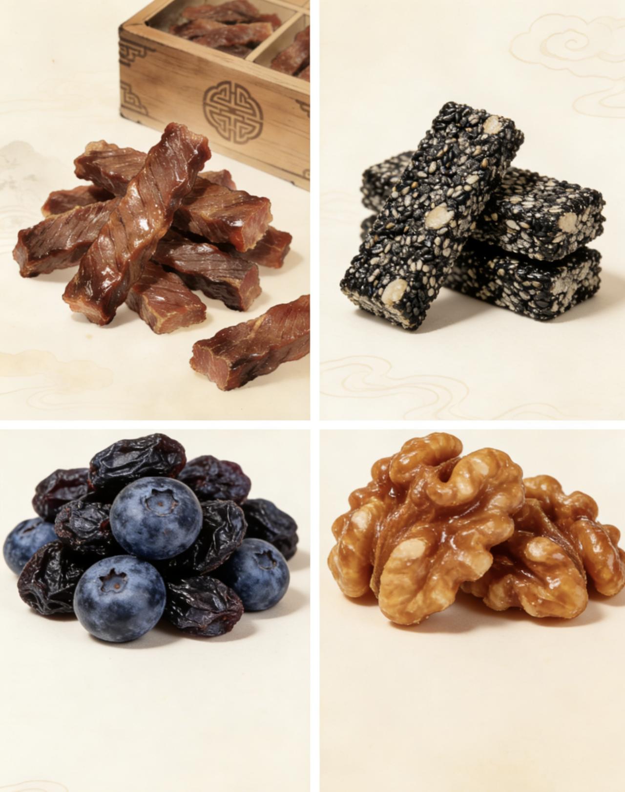 人到中年, 一定要听劝, 这4种零食,该吃就吃,腿脚有劲营养好! 牛肉干|嚼着香,补气力 牛里脊腌透炸至焦香,拌上椒麻孜然,越嚼越有味。高蛋白补筋骨,闲来揣几颗,解馋又顶饿,腿脚慢慢就有劲儿~ 黑芝麻酥|甜酥香,固本源 黑芝麻炒香裹上蜜糖,压成酥块,甜而不腻。黑养肾、钙量足,每天两三片,健脾补气血,吃着暖心又养身~ 蓝莓干|酸甜口,护容颜 新鲜蓝莓洗净晒透,凝住自然酸甜。花青素明目,轻钙养骨,追剧唠嗑来几颗,润嗓养颜,越吃越年轻~ 琥珀核桃|嘎嘣脆,护心智 核桃去涩裹蜜炸酥,裹上白芝麻,琥珀色亮晶晶。补磷铁、润脏腑,35岁后每天嚼几颗,防早衰、养精神~ 人间至味是家常,中年养生,何须珍馐玉酿?一口小食,一味安康,愿三餐有味,四季无忧,步履轻扬,岁岁长安。