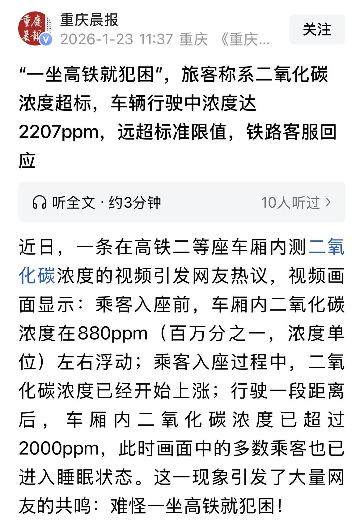 “真相了!”男子发现自己一坐高铁就特别容易犯困,提前喝咖啡都不管用,他觉得车厢空气一定有问题,就在一次坐高铁时,带着专业仪器检测了二等车厢里的二氧化碳浓度,他惊讶发现,行驶中浓度竟达到2207ppm,已经远超标准,对人体有影响,所以才会变得昏昏沉沉。对于这件事,12306客服的回应让人哭笑不得。 这背后隐藏的真相,让人不禁陷入深思。我们习以为常的高铁,似乎变成了一个“隐形杀手”。空气质量差,二氧化碳浓度飙升,这不仅仅是个技术问题,更是关乎千万乘客健康的大事。难道,我们每天奔波在高速铁轨上的“移动隔离舱”,真的就没有人关心过它的空气质量?这不禁让人质问:我们的出行体验,究竟是为了方便,还是为了健康? 更令人愤怒的是,面对乘客的检测结果,12306客服的回应竟然如此“官方而冷漠”:“车厢空气质量符合国家标准。”这句话仿佛在告诉我们:只要没有明确的标准线,就可以忽略空气中的二氧化碳浓度?难道我们的健康,就这么被“标准”绑架?这种回应,难免让人觉得像是在敷衍了事。难道我们每一次的“靠窗呼吸”,都要靠“标准”来衡量?还是说,标准本身就有漏洞,无法反映真实的健康风险? 事实上,这不仅仅是个“技术问题”。它折射出一个更深层次的社会问题:在追求效率和利益的同时,我们是否忽略了最基本的人性关怀?高速铁路的背后,是数以千万计的乘客期待一段安全、舒适的旅程。而空气质量,正是这份安全感的基础。可如今,似乎有人在“标准”上打了折扣,让我们的健康成为了“次要”。 这件事,也许只是冰山一角。随着城市化、交通的飞速发展,类似的“隐形问题”还会层出不穷。我们需要的不仅是技术上的改进,更是制度上的完善和责任的担当。每一位乘客,都值得拥有一份“安心”的出行体验。而不是在车厢里暗暗担心空气中潜藏的隐形杀手。 最后,或许我们每个人都应该从自己做起:多关注公共环境的改善,勇敢发声,督促相关部门重视空气质量。毕竟,健康无价,没有什么比生命更重要。希望未来的高铁,不再只是速度的象征,更是健康与安全的保障。让我们一起期待,那一天真正到来——乘坐高铁,不再担心“隐形杀手”的威胁,而是安心享受每一次旅程的美好。