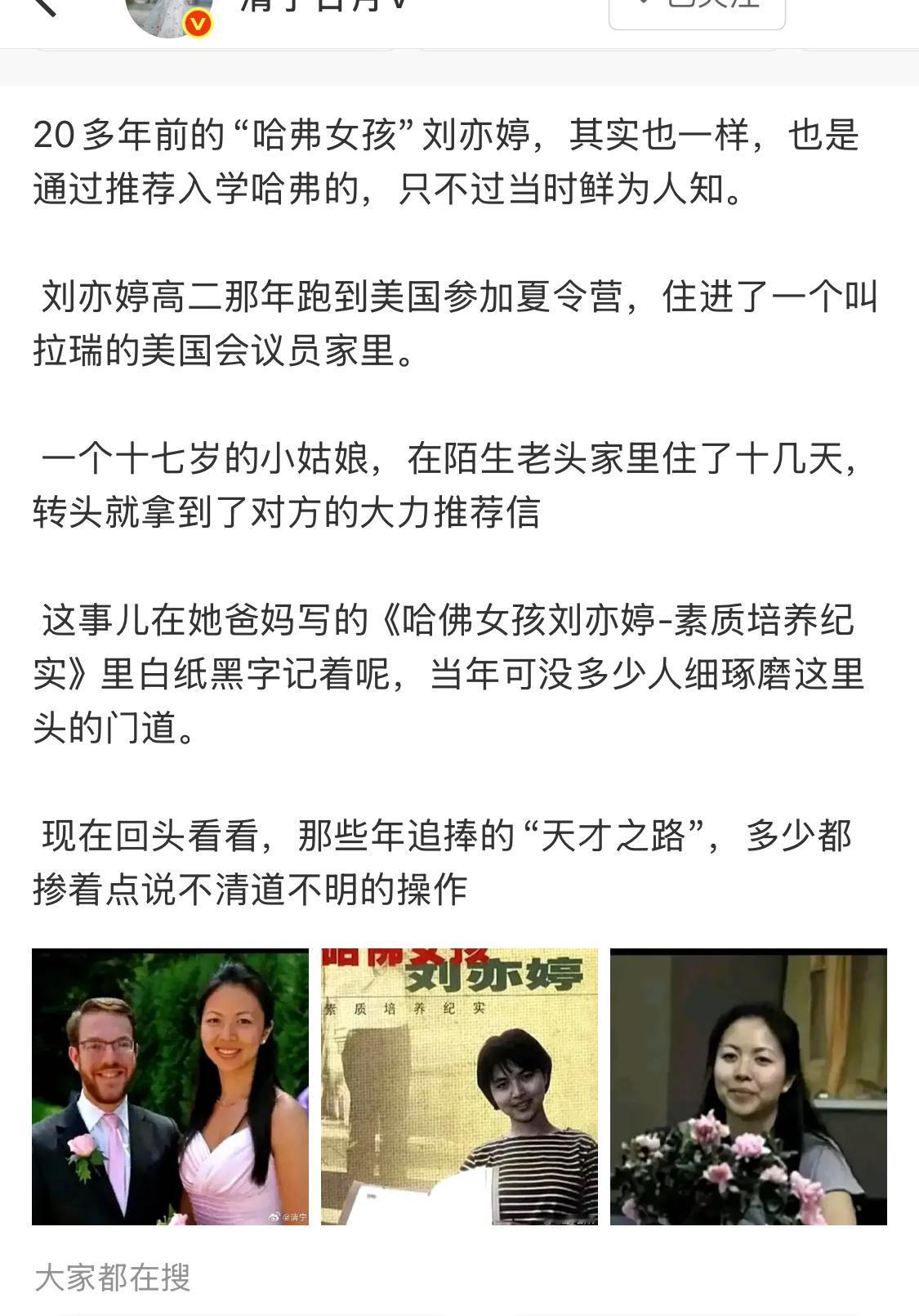 哪里有什么所谓天才女孩?一代又一代的哈佛女孩,都是走同样的老路,美国议员的推荐信是她全额奖学金进哈佛读本科的决定性因素。后来她考哈佛的研究生就怎么都考不上。[马思纯的微笑] 她那种“成功”是地理和时代错位导致的,在现在根本算不算所谓“成功”当年哈佛女孩刘亦婷曾:发誓报效祖国,结果却嫁给了老外,定居美国外!获绿卡,嫁给哈佛校友(白人律师Scott Sambur),育有子女,生活低调。 社交媒体偶有露面,无高调曝光或回国发展的公开动向,网络评价多聚焦“回归普通中产”。女孩留学 华人女学霸