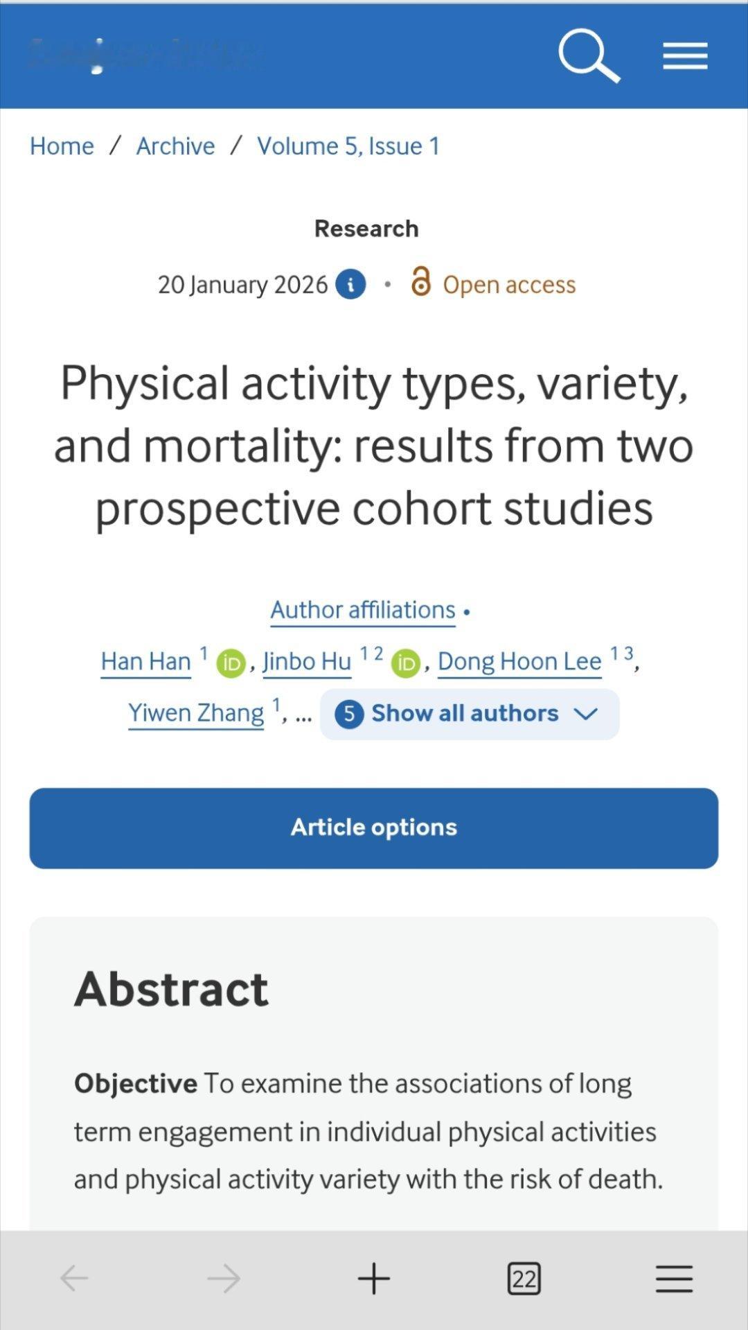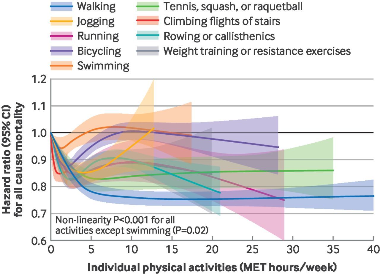 同志们看这个:这篇BMJ子刊再次得出同一个结论:生命在于运动!每天只需要少量的运动(比如步行6000步)就可以有效降低全因死亡率、心血管病等风险!!⚠️¹ 重点是你不需要非得做太复杂、太高负荷的运动!简简单单地快步走就非常有效!图1:步行,相对风险比HR:0.83!⚠️慢跑,HR:0.89,跑步,0.87,骑自行车,0.96,网球或壁球,0.85,爬楼梯,0.90,划船,0.86,力量训练或抗阻训练,0.87。² 以个人最喜欢的步行为例:每个礼拜累计运动5个小时,平均每天40分钟,差不多相当于5000~7000步。非常喜欢这个数字!因为更多的研究反复告诉我们:坚持每天走四五千步,最好是六七千步,就可以大幅降低全因死亡率、心血管发病率。³ 总之,生命在于运动,每天走五六千步,后背、腋下微微出汗那种就很好了!科学人医疗社会史