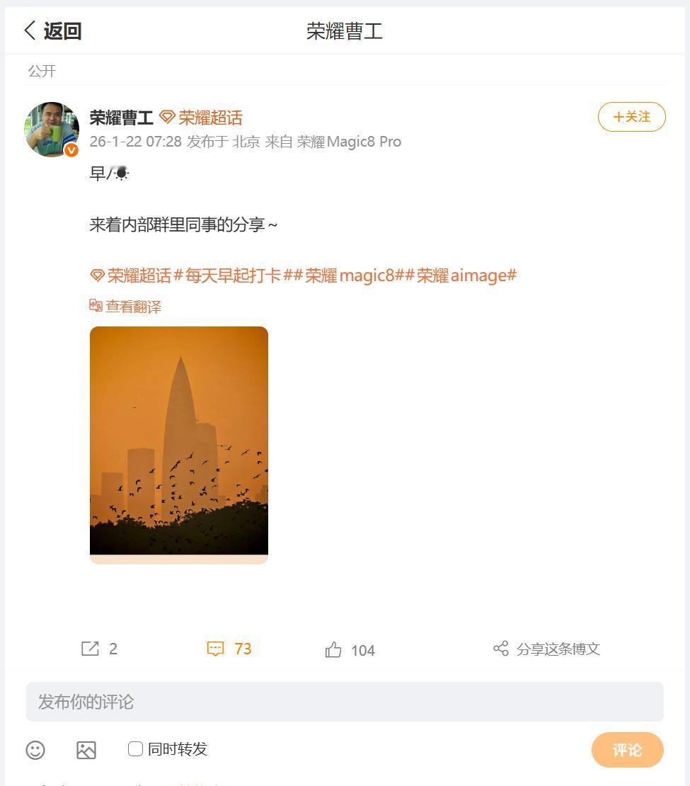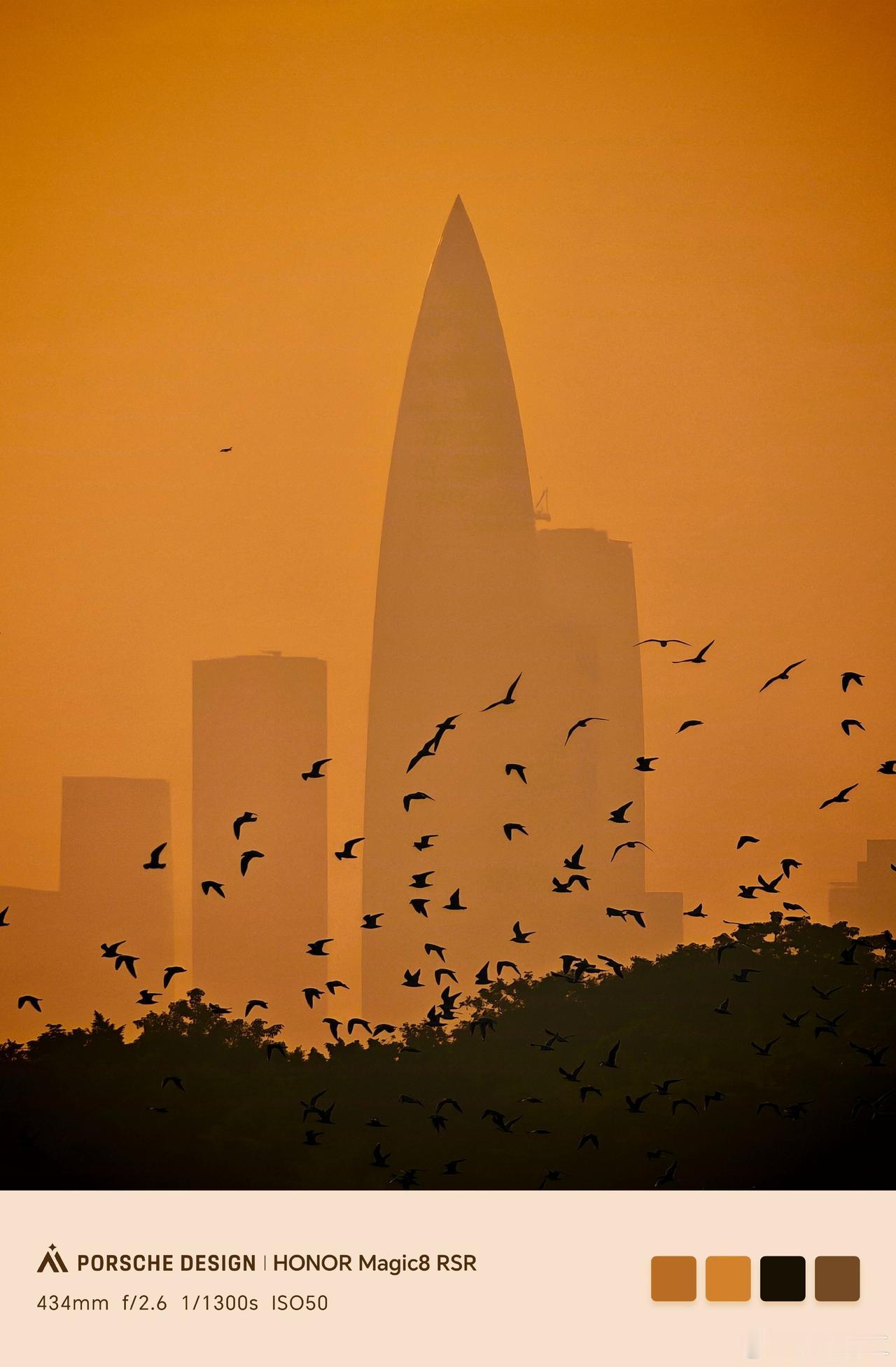 暮色中的深圳湾是什么样子的呢?刚刚看到荣耀研发工程师曹工,分享了利用荣耀Magic8 RSR保时捷设计,利用潜望长焦拍摄的这张照片,暖橙色的黄昏色调与建筑、鸟群的黑色剪影形成强烈对比,很喜欢现代城市与自然生态完美融合画面,追色水印更凸显了这种氛围感 畅聊数码新品 数码资讯