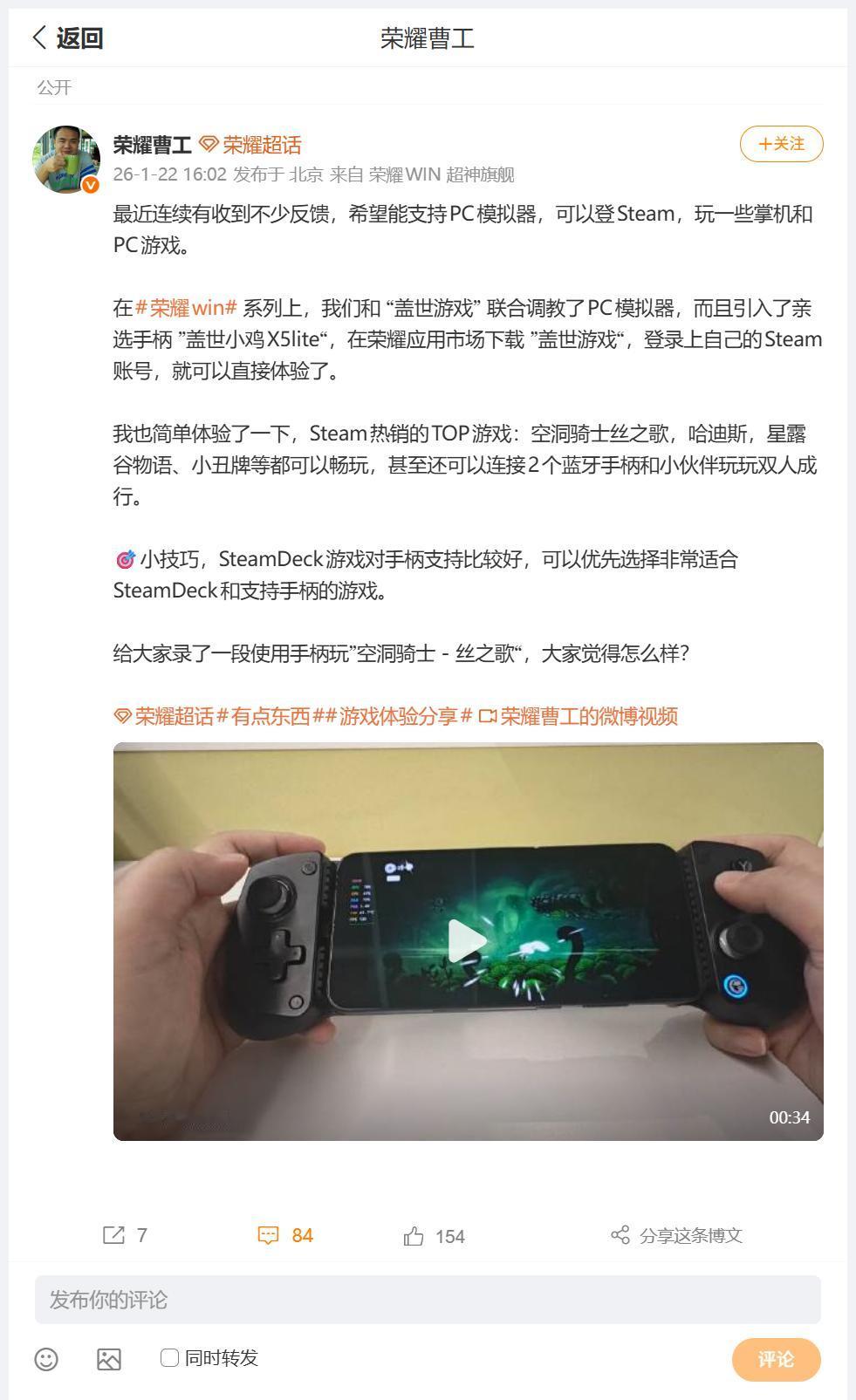 利用荣耀手机搭配,亲选手柄盖世小鸡X5lite,居然可以玩Steam游戏?小伙伴们不要怀疑,这是真实的,刚刚看到荣耀研发工程师曹工,分享了一则图文,介绍了荣耀WIN调教了PC模拟器,应用市场安装盖世游戏,登录Steam账号之后,搭配亲选手柄可以玩多款游戏,例如空洞骑士丝之歌,哈迪斯,星露谷物语、小丑牌等等,据说还能双打,果然定位游戏旗舰,居然覆盖到了PC端游 畅聊数码新品 数码资讯