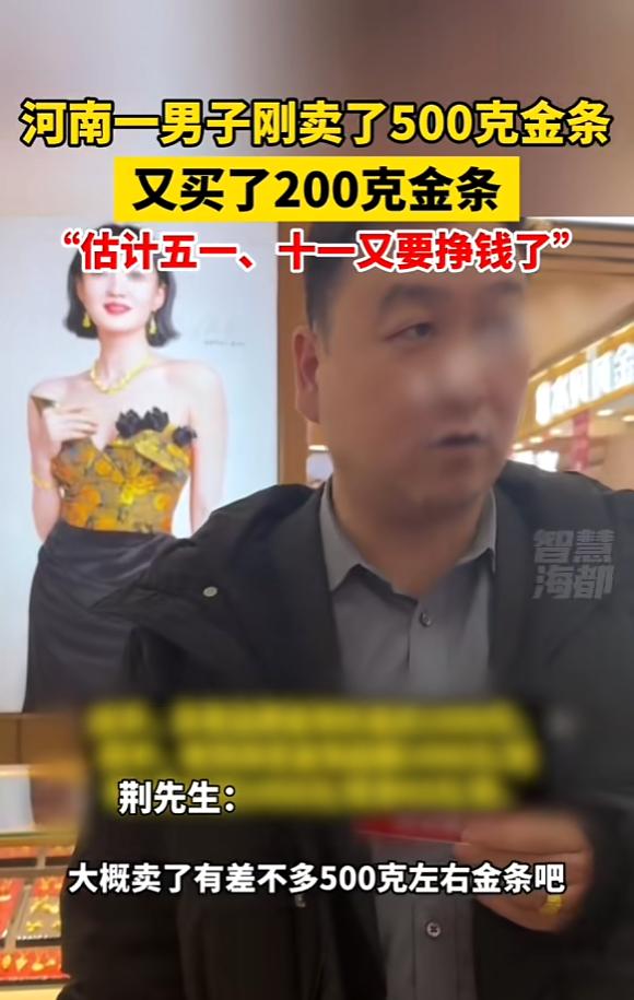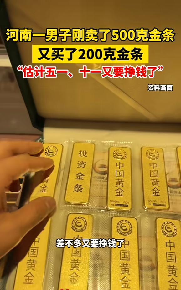 “简直赚翻了!”近日,河南郑州,一男子见黄金克价逼近1500元,果断卖掉手中500克的金条,这些金条都是他以600元克价购入的,现在直接净赚几十万!卖完后,他又反手买了200克金条,计划等重大节日再出手。网友:太有头脑了! 事情是这样的,郑州这位荆先生(化名),本身就是个黄金爱好者,平时就爱关注金价的涨跌,算不上什么金融专家,就是多年养成的一个习惯。 他手里的500克金条,是早些年金价还很低的时候买的,当时每克也就600多块钱,放在手里捂了挺久。 最近这阵子,金价一路狂飙,国内金店的足金克价都逼近1500元了,荆先生观望了好几天,觉得已经达到自己的心理价位,再不出手万一回调,之前的涨幅可能就缩水了。 于是他果断拎着500克金条去了金店,一次性全部卖掉。 大家简单算笔账就清楚了,每克净赚差不多800块,500克算下来,直接净赚40万出头,这可不是一笔小数目,相当于普通人几年的工资了。 换做是谁,这笔收益都足够让人开心,但荆先生的操作,却出乎了所有人的意料。 卖完金条,拿到几十万现金,荆先生也没闲着,回到家喝了杯茶,心思又活络起来。 他没想着把钱存起来或者拿去别的地方投资,反而转头又去买了200克金条。 按照他的想法,现在金价虽然已经很高,但后续还有五一、十一这样的重大节日,消费旺季来临,金价说不定还会有上涨空间,到时候再出手,还能再赚一笔。 很多人不理解,觉得他这是多此一举,高位再买入,万一金价下跌不就亏了? 其实不然,荆先生的操作看着矛盾,实则很理性,他卖掉500克,是为了把大部分收益落袋为安,避免金价短期波动带来的风险,相当于先把赚的钱攥在手里,心里踏实。 而反手买200克,也不是冲动之举,而是留有余地,他本身就关注金价多年,知道黄金的避险属性一直都在,再加上重大节日期间,黄金的消费需求会增加,大概率会带动金价小幅上涨。 就算到时候金价没涨甚至下跌,因为买入的量不多,也不会有太大损失,相当于用一小部分资金,赌一个后续的可能收益。 这事儿也折射出很多普通人投资的误区,要么就是太贪心,金价涨了还想再涨,一直抱着不放,结果错过最佳卖出时机,最后竹篮打水一场空;要么就是太恐慌,金价稍微下跌就慌了神,赶紧低价抛售,反而亏得一塌糊涂。 荆先生的做法就很接地气,不追求买在最低、卖在最高,只赚取自己认知范围内的利润,见好就收,同时又不完全离场,保留一点参与感和期待。 其实投资就是这样,不一定非要追求多大的收益,稳妥、理性,反而能走得更远。 当然,也有人觉得,现在金价已经处于高位,荆先生这个时候再买入,风险大于收益,后续大概率会亏。每个人的看法不一样,毕竟金价走势谁也没法百分百预测。 对此您有什么不同的看法,可以在评论区留言讨论!!! 信息来源:《河南一男子刚卖了500克金条,又买了200克金条,期待五一、十一再次获利》海峡都市报