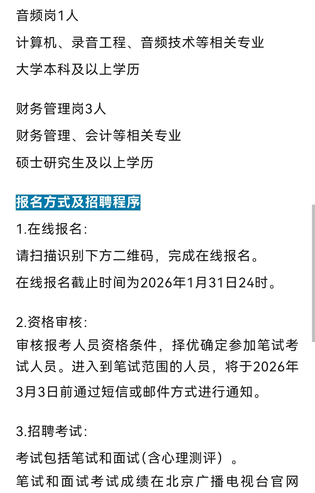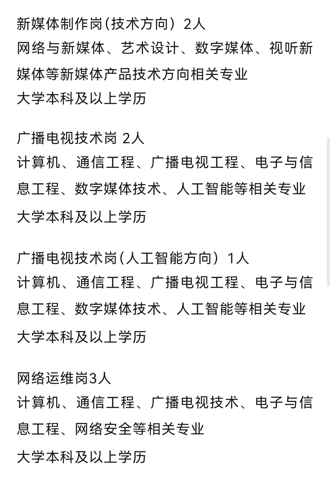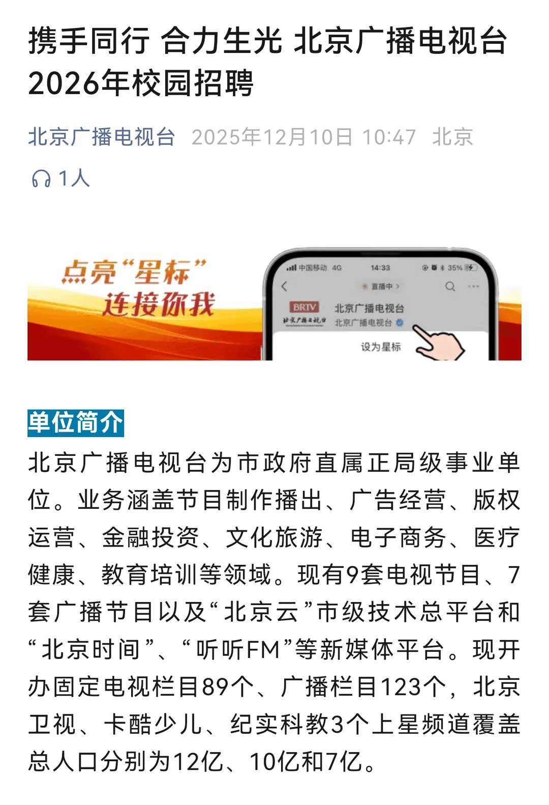 💪北京广电校园招聘2026正式启动 ✅本次共招收24名应届毕业生,本次招聘不设置专业代码,专业符合大类要求即可报名参加 👉不出意外,所有岗位均可解决北京户口,单位大平台待遇好!值得所有文科艺术类同学报名参加! 👊考试内容分为笔试,面试环节,笔试考察行测和新闻实务,面试为半结构化面试,相关课程内容已经上传至课程平台,全程班同学可自行查看!