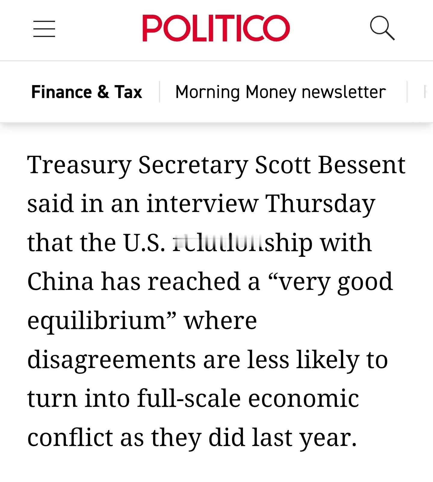 美国财政部长贝森特星期四(1月22日)接受美国“政治”(Politico)新闻网站采访时谈及美中关系的“平衡状态”。贝森特称,因美中关系已达至“极佳平衡状态”,双方分歧不太可能像去年那样演变为全面的经济冲突。贝森特他补充说:“整体关系定下基调后,中间出现的任何小问题或摩擦,双方可立即通过电话沟通,局势即可迅速缓和”。