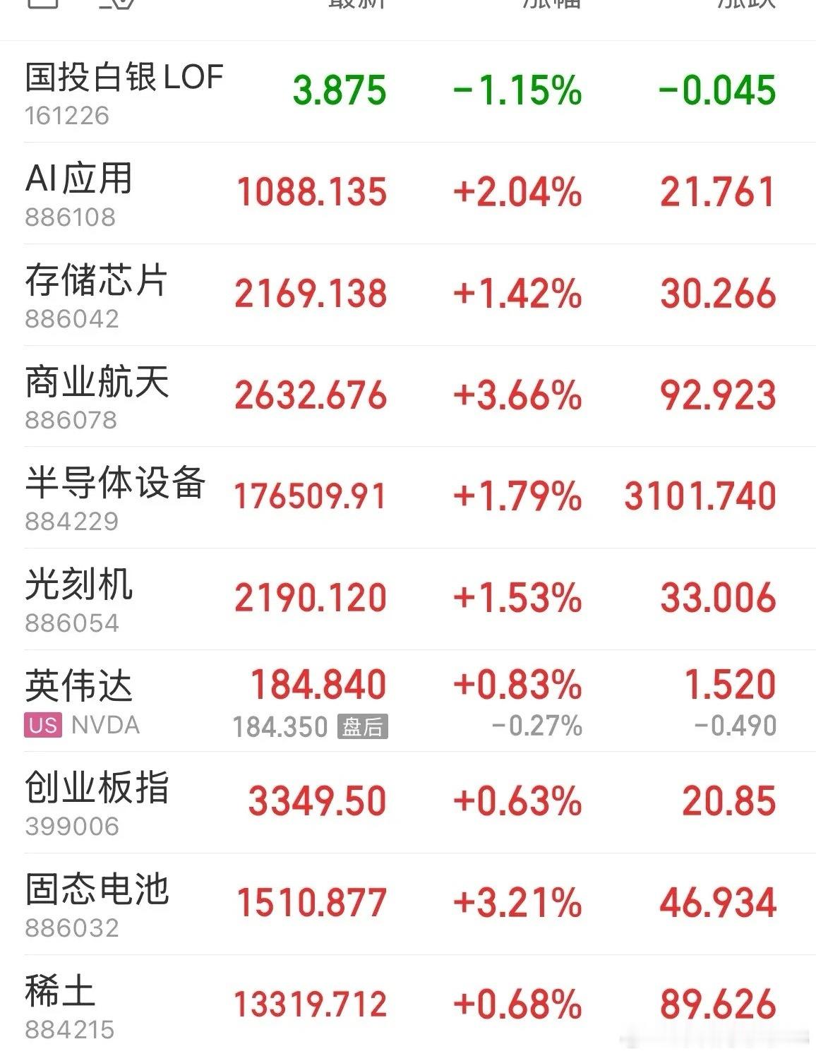 新概念加持,3.1万亿,放量4000亿,商业航天大涨3.66%,半导体设备从跌幅超1%到涨幅1.7%,AI应用大涨2%,固态电池大涨3%,光伏大涨3.47%,创业板涨幅0.63%新概念出来,叫太空光伏,光伏在太空的加持一下,直接起飞飞上天去了,场外光伏指数大涨3.47%,场内光伏ETF暴涨超9%,这就是遇到风口猪都会飞起来了,商业航天在昨天大涨之后,今天再度惊人表现,直接暴涨3.66%,盘中卫星ETF更是直接涨停板了,压制太久了,又碰到风口了,商业航天从概念到实操的转变,半导体产业链今天走出了反转行情,早盘半导体设备、存储芯片、光刻胶等集体回调,午后集体探底回升,半导体设备从跌幅1.4%到涨幅1.79%,存储芯片从跌幅0.7%再直接拉升涨幅1.4%,今天领涨的是商业航天、固态电池、光伏,AI应用止跌,贵金属冲高回落,新能源大涨4%,一周交易结束了,周末愉快。