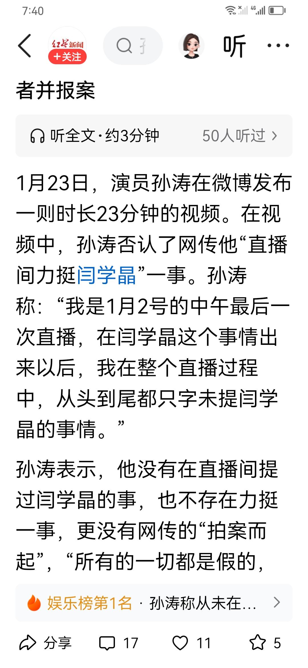 孙涛躺枪。否认支持闫学晶,不知谁在捣鬼,说他为闫学晶帮腔。名誉严重受损,要起诉造谣者。