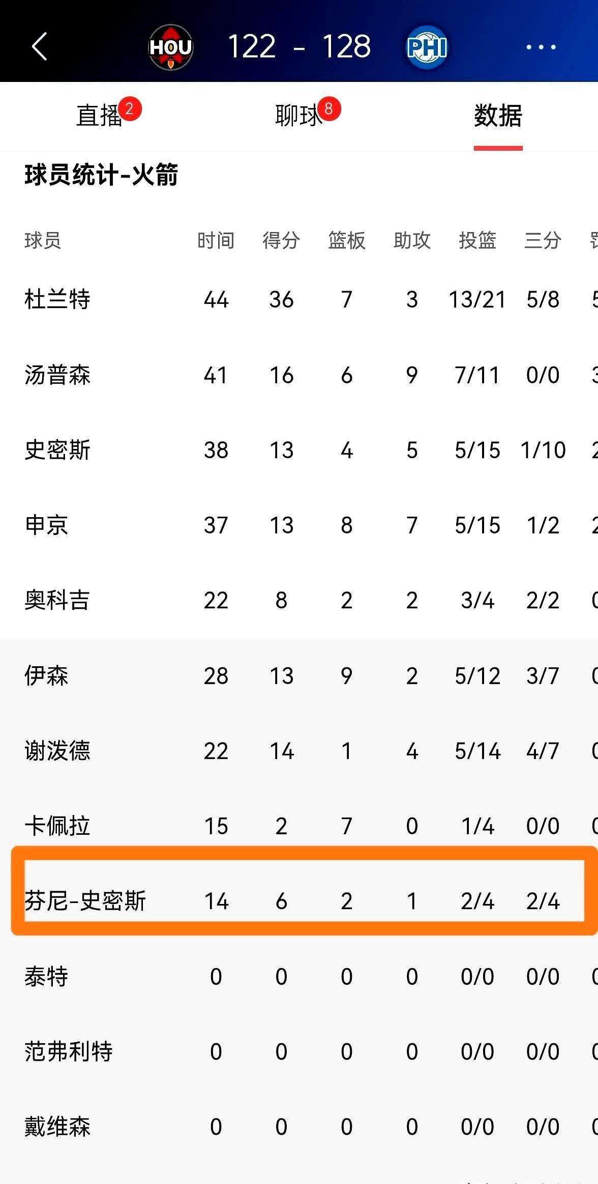 5270万合同签了个“水货”?他今天让所有人都闭嘴了。 火箭加时输给76人,3连胜没了,杜兰特拿36分都带不动。 可全场最大的惊喜,你绝对想不到,竟是那个坐在板凳上的芬尼-史密斯。 他只打了15分钟,三分球4投2中,刀刀致命。第三节一记三分把比分追平,第四节又是一记远投强行续命,场上正负值+7全队最高。 你要知道,他大伤初愈,整个赛季三分命中率才25.8%,多少人骂他是火箭休赛期最亏的一笔引援。 现在,那个能防守、能为杜兰特拉开空间的顶级3D,似乎真的要回来了。 别光盯着一场输赢,火箭这块最重要的冠军拼图,终于对上了。