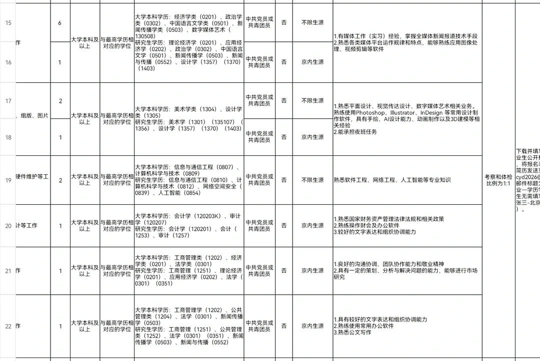 ❓️今年什么情况,中国青年报也提前这么早开了?合着除了新华社晚一点以外其他单位都提前了呗。去年中青报还是2月份开的呢,看来现在媒体单位抢人成为大趋势了。 ✅中青报属于团中y的直属事业单位,20家中央主要新闻单位之一,入职即可解决北京户口事业编制,待遇尚佳。 ✅本次招聘共招收15名应届毕业生,新闻传播学类,文学类,政治学类,法学类,艺术学类等专业均可报名。