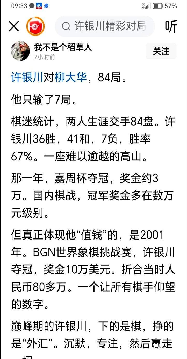 “我下不过许银川。” 柳大华直播一句话,弹幕炸了。 你把手机横过来,画面里老帅摘下老花镜,声音发颤:“6次全国冠军、3座世界冠军、7个五羊杯、5个银荔杯,他就算现在让车马炮,我也啃不动。” 弹幕飘过: “18岁夺冠的怪物!” “残局电脑,人形AI。” “2025五羊杯他又回来了!” 镜头切到许银川,49岁,头发花白,却一子落盘,全场静音。 你盯着屏幕,心跳跟着棋子“啪”一声——老将无路。 评论区刷屏: “这盘我学十年也学不会。” “柳老都服了,我键盘侠还敢嘴硬?” “今晚不睡,复盘100遍!” 柳大华补刀:“当年我赢他?纯靠他打瞌睡。” 你笑了,反手把直播分享到群: “别吵了,棋神今晚在线教学,错过等一年。”