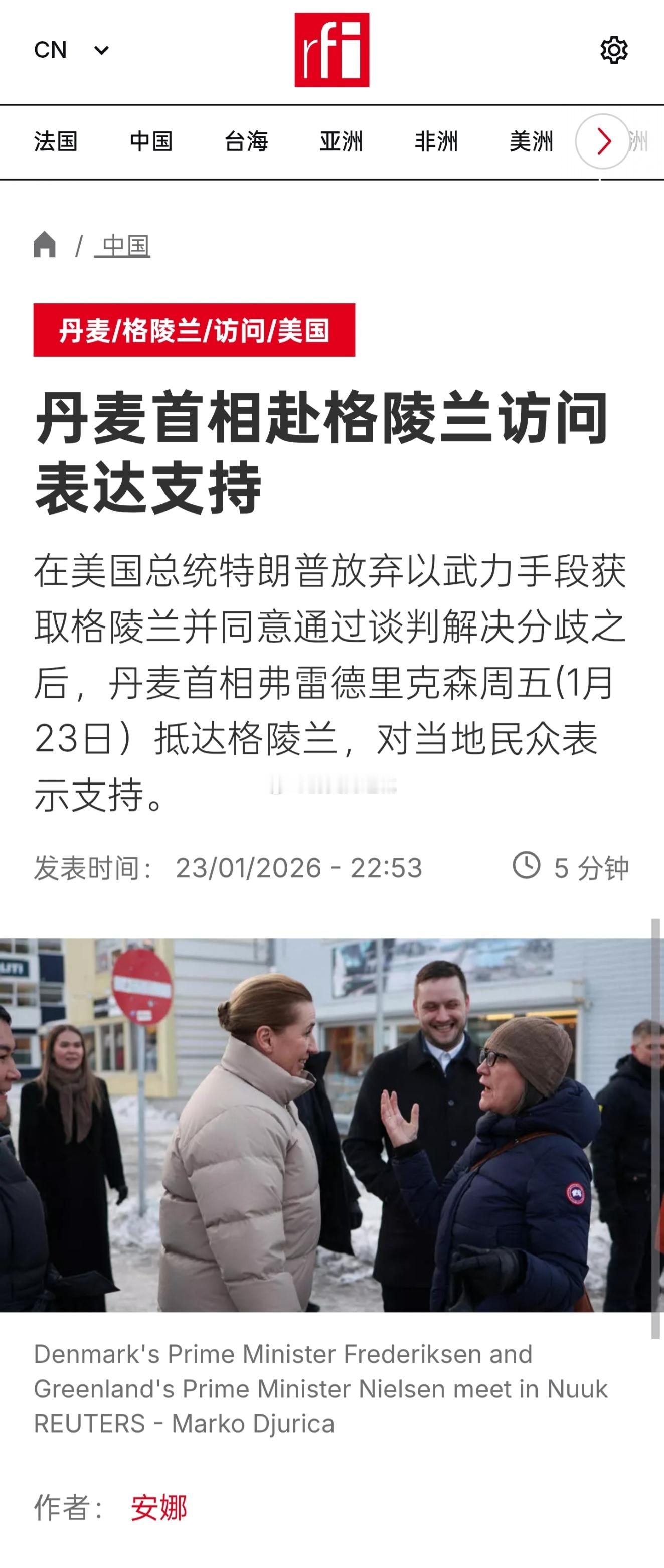 在美国总统特朗普放弃以武力手段获取格陵兰并同意通过谈判解决分歧之后,丹麦首相弗雷德里克森周五(1月23日)抵达格陵兰,对当地民众表示支持。弗雷德里克森表示:“我此行是为了表明丹麦人民对格陵兰人民的坚定支持。在此严峻时刻,我们需要并肩站在一起。”当天早些时候,弗雷德里克森在布鲁塞尔会见了北约秘书长吕特。吕特随后在社交平台上表示:“我们正共同努力,确保整个北约的安全,并将在既有合作基础上,加强北极地区的威慑与防御能力”。海外新鲜事