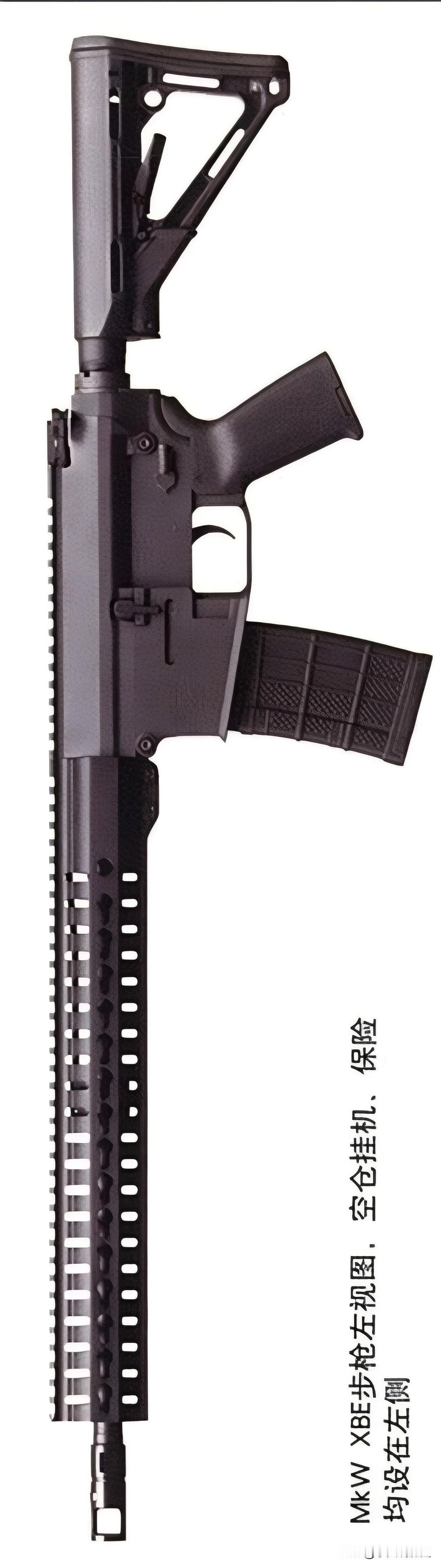 CMMG公司MkW XBE步枪 CMMG公司新出的MkW XBE战术半自动步枪,有个超实用的亮点——特制加强枪机,用着更耐用。机身上下部分都用了7075-T6航空级铝合金,拿在手里不沉。 下机匣线条利落还好使,弹匣口有引导边,换弹匣特别顺。 护手是铝合金做的八边形,顶部的导轨和机匣连在一起,装瞄准镜很方便,两侧和下面能装Key-Mod导轨,其他面还有长条散热孔。 枪管是不锈钢的,长409毫米,表面做了盐浴氮化处理,不容易磨损,枪口还有制退装置。 枪托能调6个档位,缩起来总长851毫米,空枪才3.4公斤。 它用的0.458英寸SOCOM弹和5.56毫米 NATO弹一样长,能装在M16/M4的标准弹匣里,就是口径大了,20发弹匣能装7发,30发的能装9发。