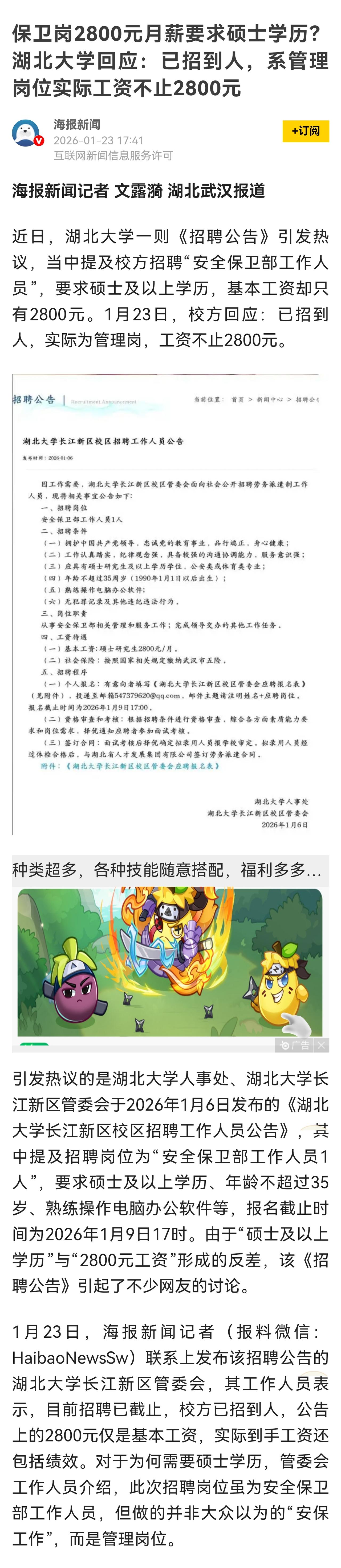 还有网友对高校保安岗要求硕士学历大惊小怪,可见他们太缺乏对当前就业形势的了解了。再过几年,有的高校招保安岗将学历要求提高到博士,也很可能。因为现在每年毕业博士已经超过10万。这就是卷学历,以及研究生教育满足考研需求不断扩招的必然。 学历高消费、高学历低就业,是全社会不愿破除唯学历观念,各方力量共同作用的结果。家长希望孩子提升学历,学校以学历为卖点吸引学生,用人单位水涨船高提高学历要求,家长再以此为由让孩子追逐学历……现在看不到任何改变的迹象。最终都要承受学历通胀、学历大贬值的后果。