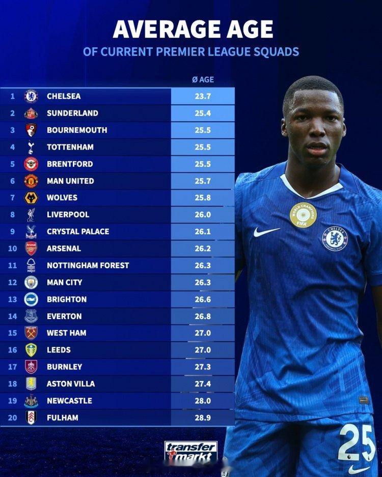德转列英超各队平均年龄:切尔西23.7岁最小,阿森纳26.2岁排名第10,富勒姆28.9岁最大 阿森纳vs曼联 阿森纳著名教授 英超联赛