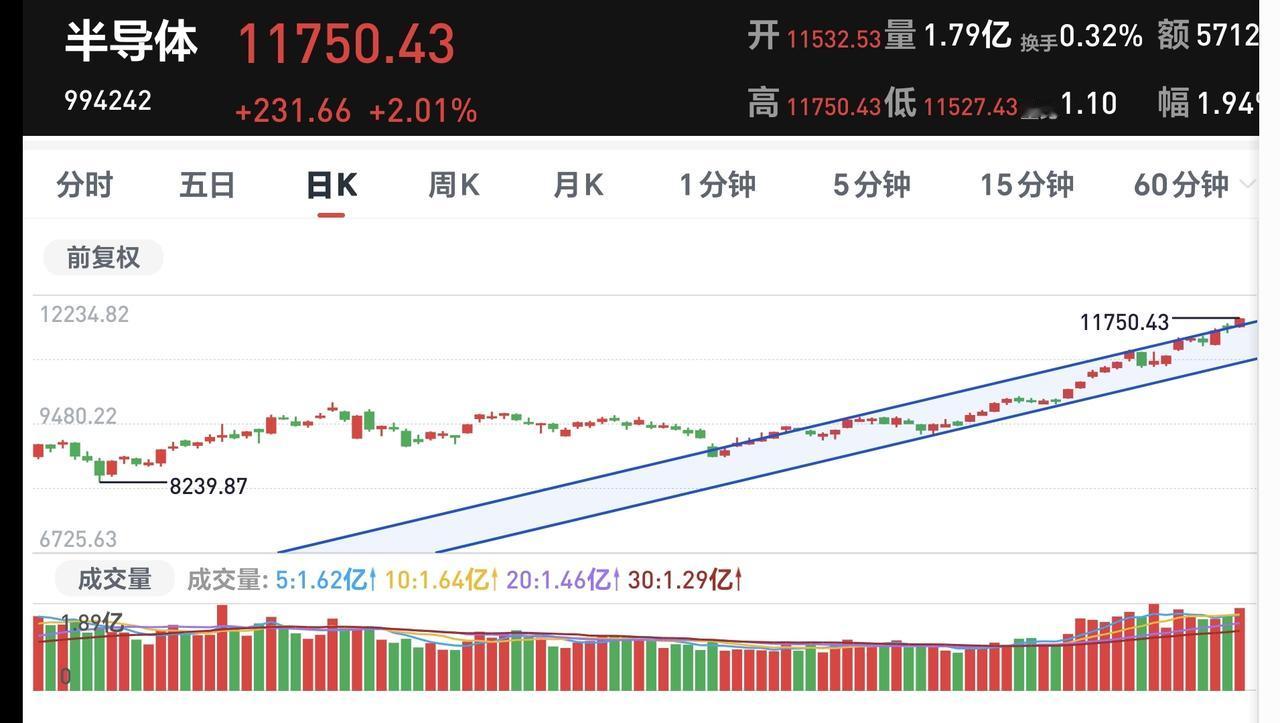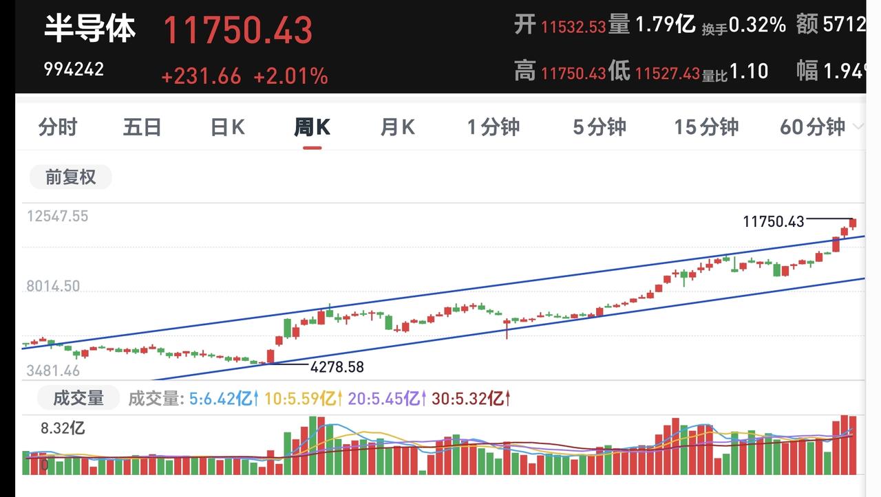 基金:没有几个人知道答案,很多时候,你看着有些数字杂乱无章,但他们当中隐藏着某些规律,只是你能不能发现这些规律。 基金的画线也是这样的,也是找规律的一种,看下面的截图2,这是半导体板块日K线图,这个板块在两条线之间运行了很长时间,这就是规律,周五上涨突破了这个上涨通道的上轨线,就是突破了规律,就是改变了原有的运行区间,向上突破上轨线,就是有可能进入加速走势,向下跌破下轨线,就是有可能改变上涨趋势。 看下面的截图3,这是半导体板块周开线图,情况跟日线级别走势图是一样的,也是在两条线之间运行了很长时间,这也是规律,只要不突破上轨线,或者是跌破下轨线,就会按照这样的规律一直运行下去,突破了上轨线,就有可能是走加速走势,跌破了下轨线,就有可能是改变原有的上涨趋势。 你能不能知道圆圈里面应该填数字几?在评论区把你的答案写出来。