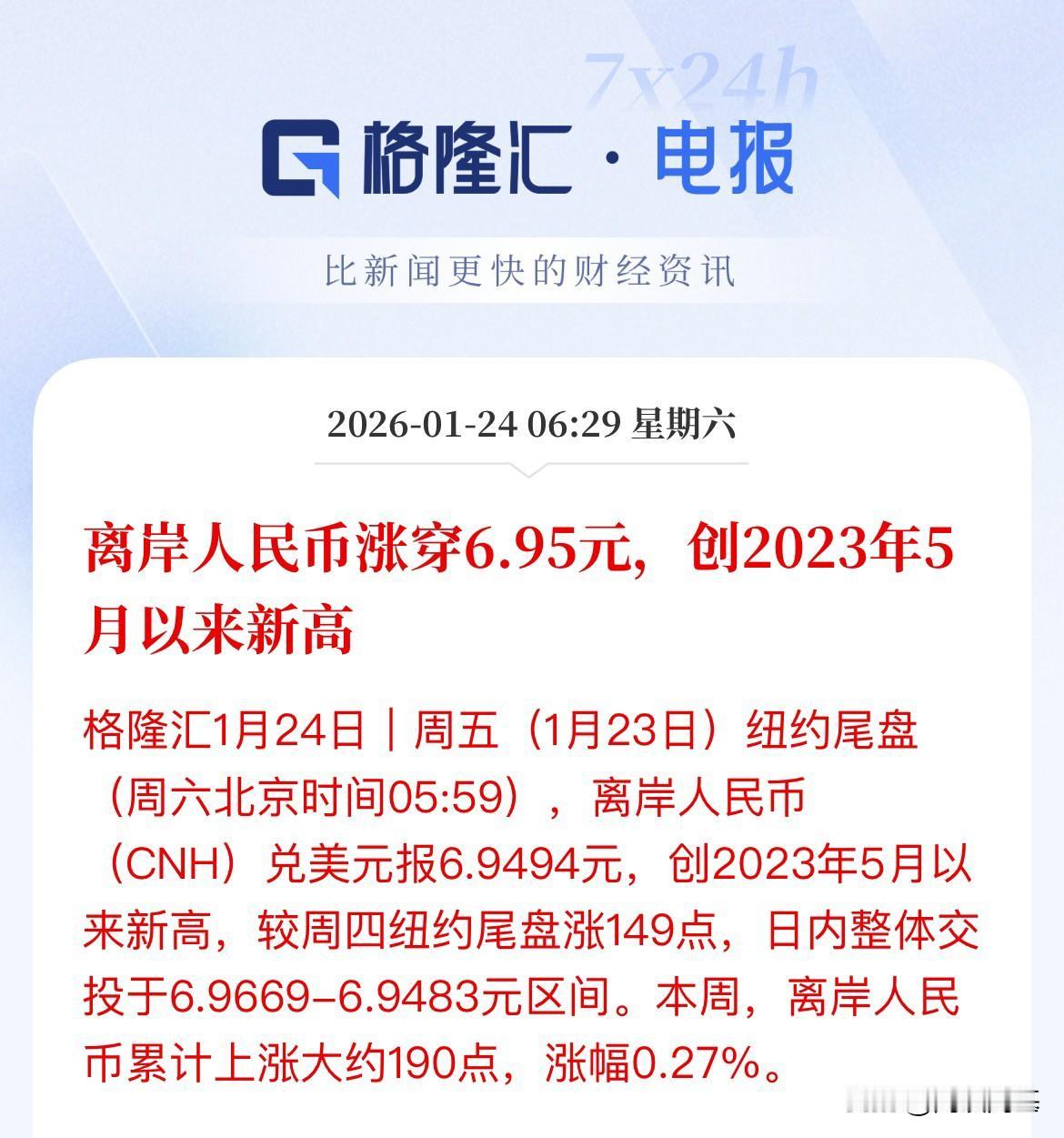 人民币突破6.95关口,涨幅0.22%,报6.94905,美元周五大跌0.77%,盘中跌落98关口,报97.5990,现货黄金探底回升涨幅0.51%,站上4980美元/盎司,现货白银暴涨6%,直接突破100美元关口后,再度拉升3美元,站上103美元/盎司,原油期货周五全线大涨,布伦特原油期货大涨3.48%,冲上66美元关口。