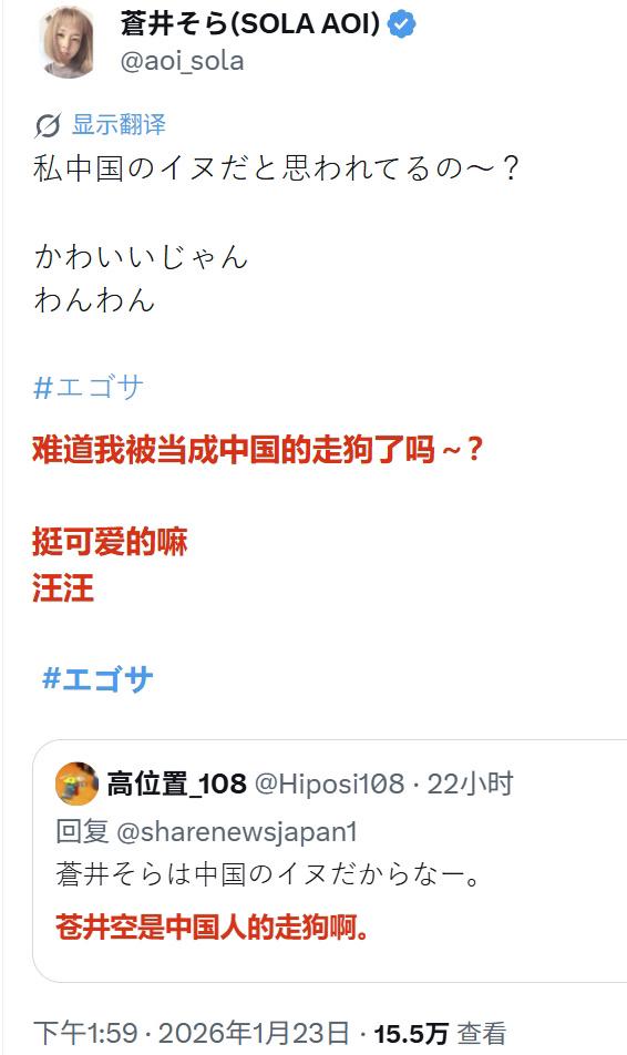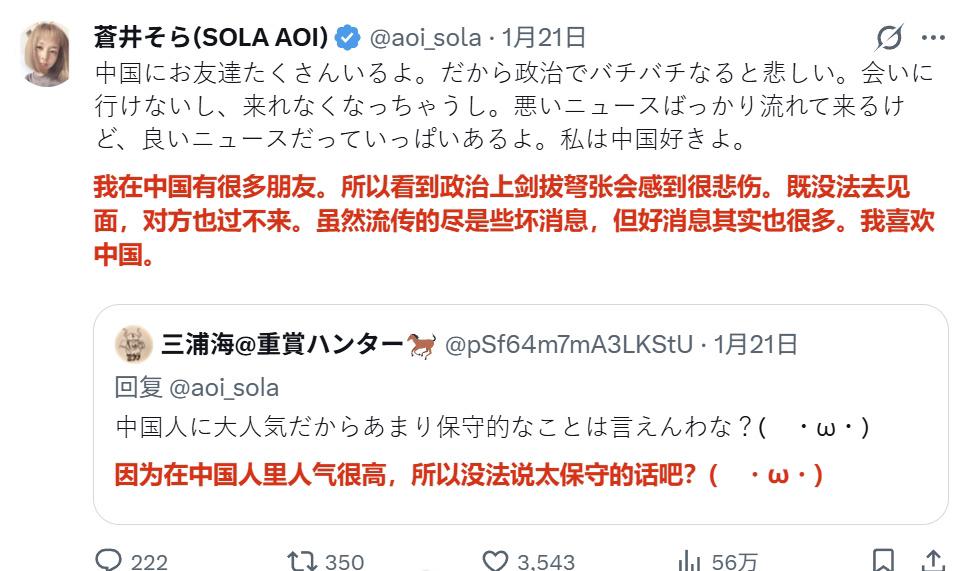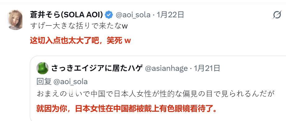 近日,苍井空因发帖说,有很多中国的朋友,她喜欢中国,结果遭到很多日本网民的谩骂!有部分日本网民说,就是因为她,才造成了日本女性在中国被戴上有色眼镜看待! 话说日本女性被有色眼镜看待跟苍井空有啥关系…这不是因为你们自身对女性进行压迫造成的么,苍井空也只是被压迫者之一….