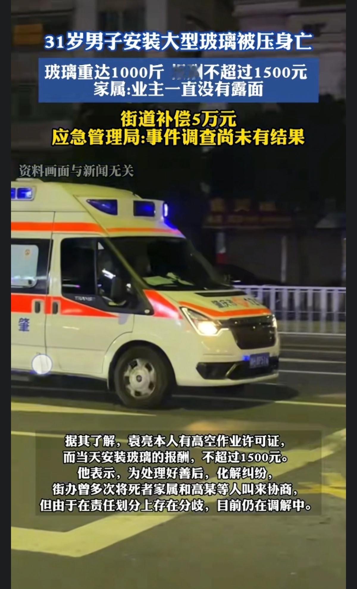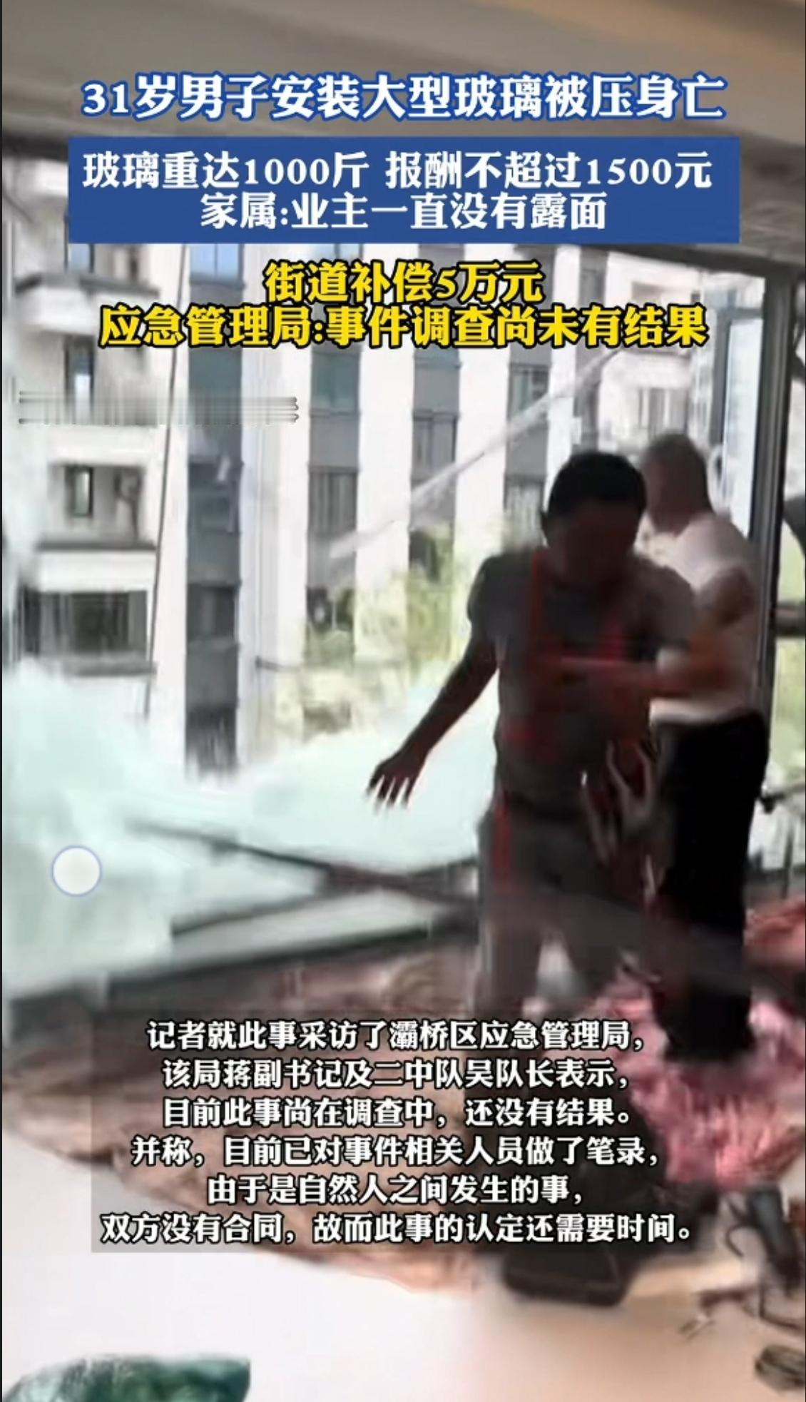 这个新闻看完心里堵得慌, 一个31岁的小伙子, 有正规高空作业证, 就为了一天千把块钱的工钱, 去安装一块1000斤的大玻璃, 结果出意外走了。 最让人揪心的是,事发之后, 业主一直没有露面, 家属一直在等待一个说法。 街道办已经垫付了5万元补偿, 但钱换不回一条活生生的命, 更填不满家人心里的窟窿。 现在应急管理局还在调查, 但网友都在等一个答案: 这么重的玻璃, 施工安全措施到底有没有做到位? 出了这么大的事, 业主为什么一直不出现? 施工事故的责任到底如何界定 谁能给个说法 大家都是普通人, 上有老下有小, 谁都不想看到悲剧发生。 但是现在已经发生了 就不能光想着怎么推卸责任, 而应该积极面对早点处理, 更要吸取事故的教训, 避免再次发生! 你觉得这事儿的责任该怎么分?